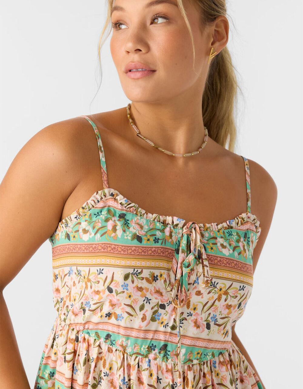 O'Neill Delena Mini Dress. Ready for sunshine woven mini dress that features a flowy fit design and colorful floral print. Drawstring at front V-neckline. Ruffles at neckline. Elastic waist. Adjustable straps. 24 1/2" length. 100% Viscose. Imported.