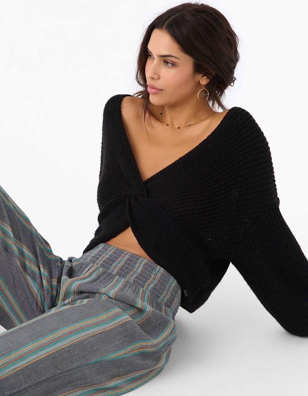 O'Neill Hillside Reversible Sweater. Make some plans in this v-neck sweater! It features a twist front design and skimmer length fit. Wear two ways - twist design in front or back. V-neckline. Drop shoulder. 71% Re-Polyester 29% Acrylic Yarns. Imported.
