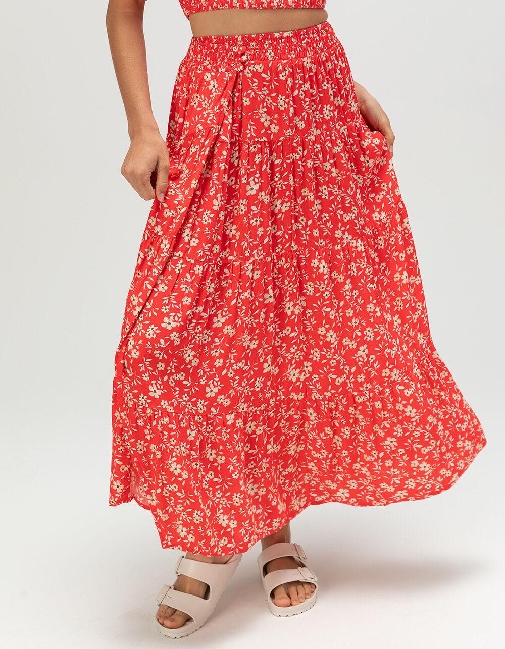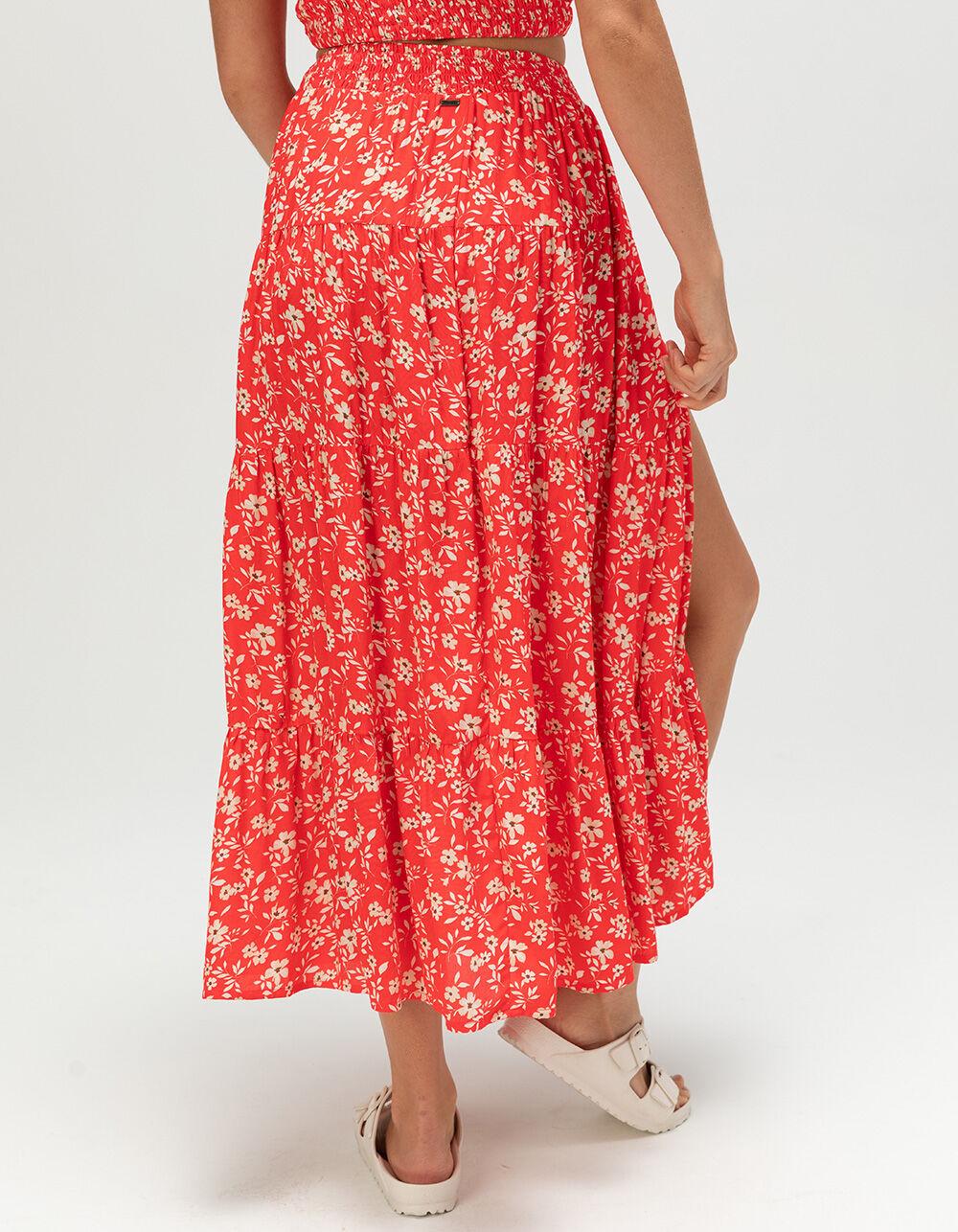 RED. O'Neill Lucia Midi Skirt. Embrace effortless elegance in this tiered midi wrap skirt. It features an allover print, elastic waist and side button placket for a breezy, feminine look that's perfect for any occasion. 34" center front skirt length. 100% Viscose Crepe. Machine wash. Imported.