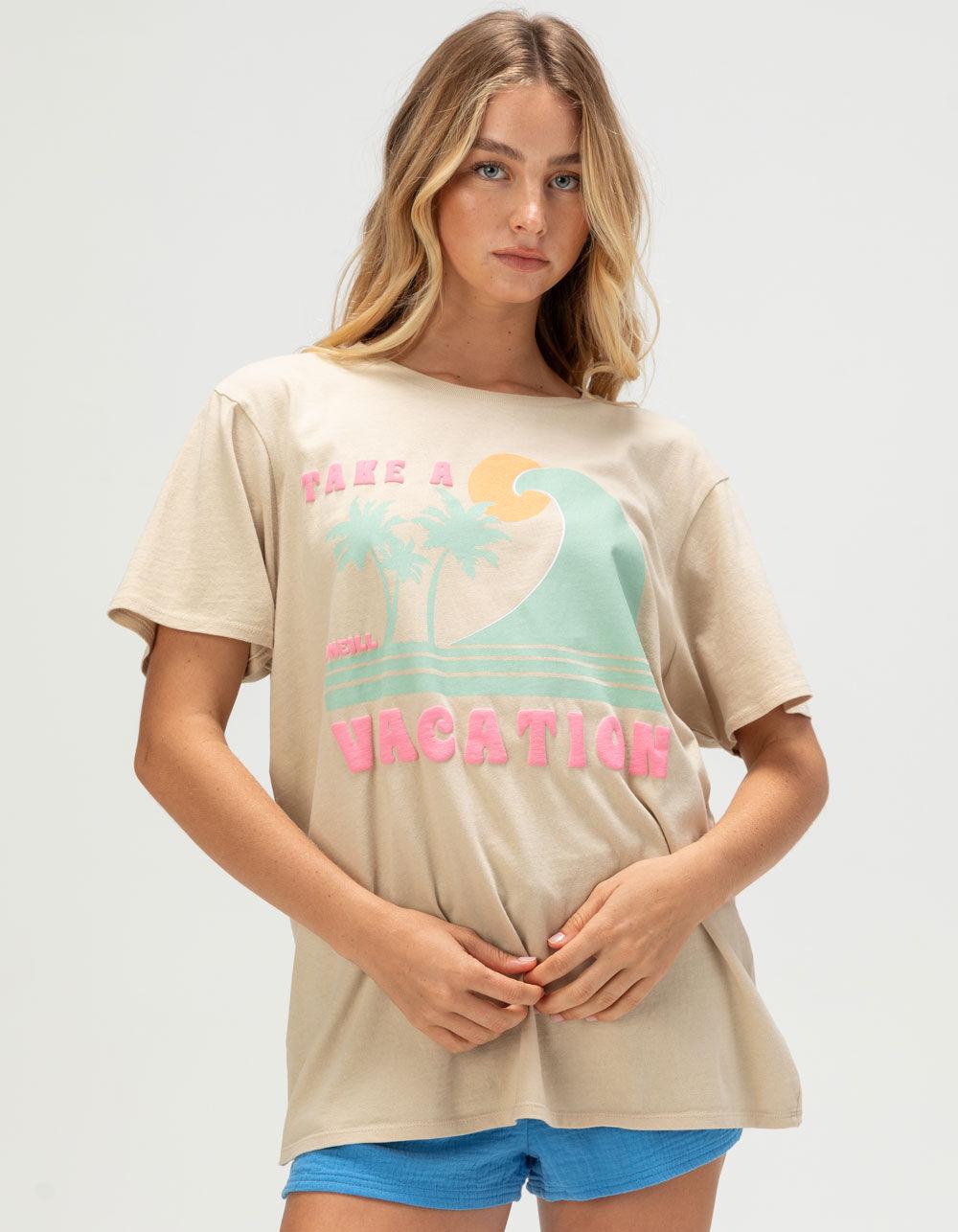 TAN. O'Neill Take A Vacation Boyfriend Tee. Large graphic screened on front with puff ink details. Oversized fit. Crew neck. Short sleeve. 100% Cotton. Machine wash. Imported.