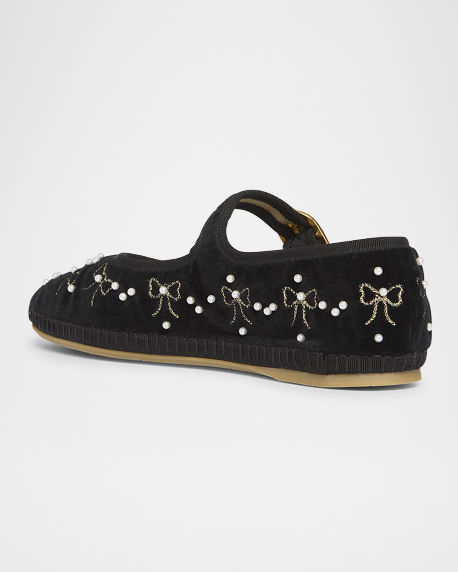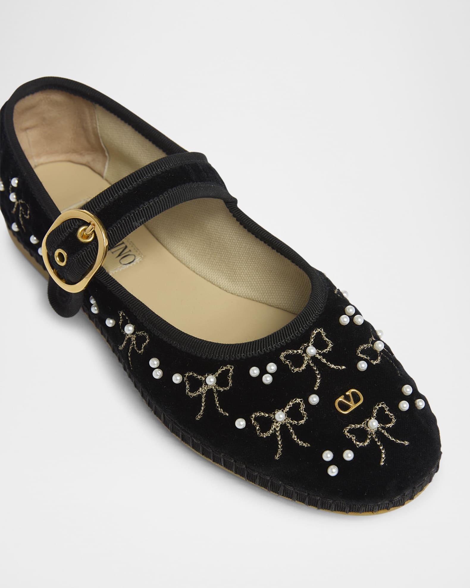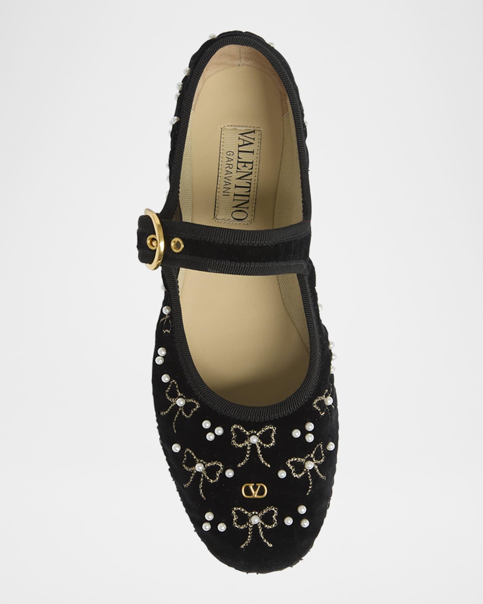 Valentino Garavani "Endouce" cotton and viscose velvet ballerina flats with metallic bow embroidery and pearlescent accents 0.17 in / 5 mm flat heel Round toe Adjustable Mary Jane strap Leather outsole Lining: Cotton/viscose Trim: Metal Made in Italy Size Note: Valentino Garavani shoes run small. Please order a 1/2 size larger than you typically wear.