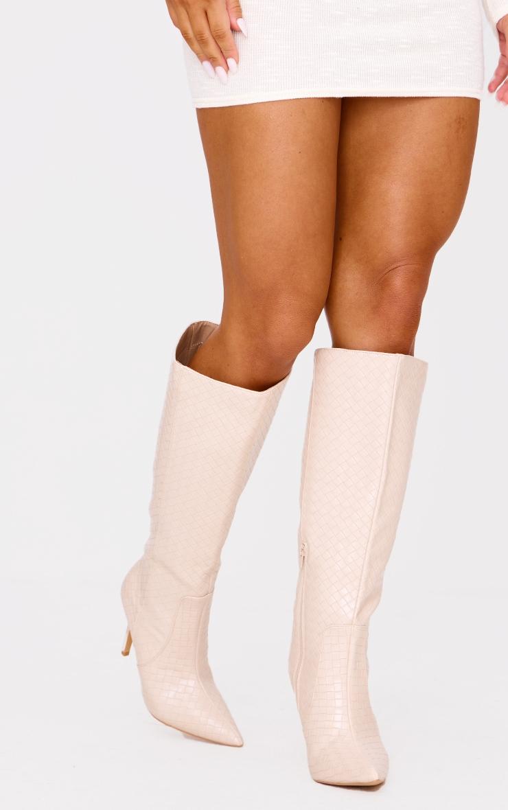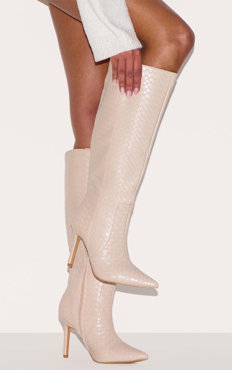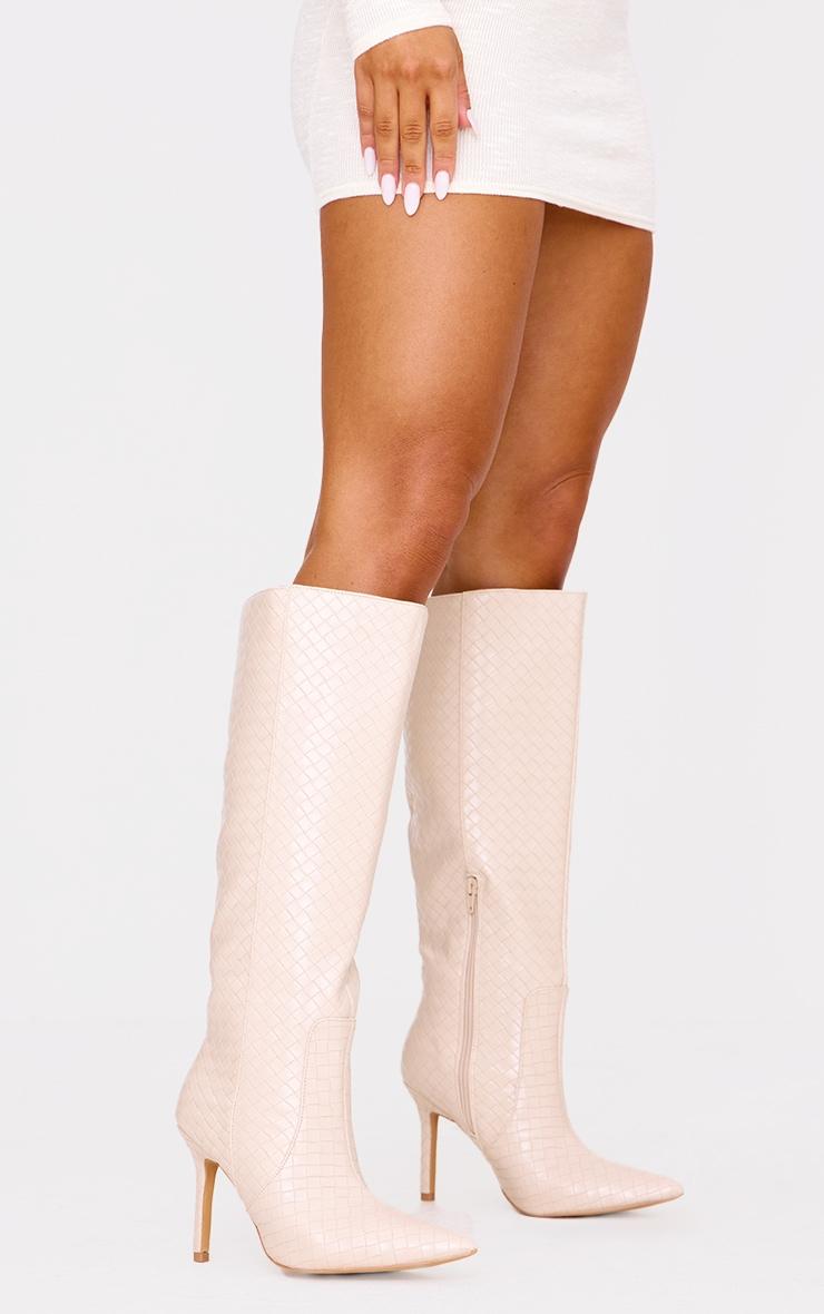Step into the new season in style with these unreal boots. Featuring an oatmeal PU material with a pointed toe design and basket weave detailing, we're in love. PU Zip fastening 4inch Heel p]:!mb-0inch>Category: FootwearProduct type: Heeled Knee High BootsColor: Oatmeal Design: PlainOccasion: Day