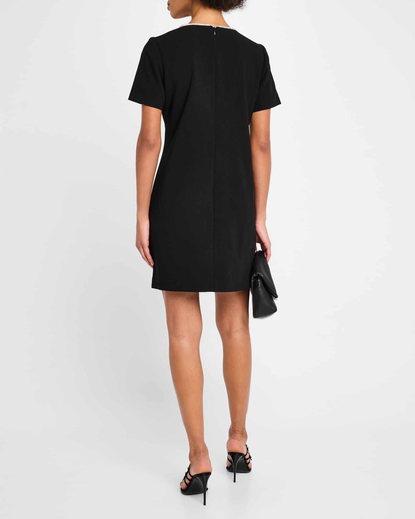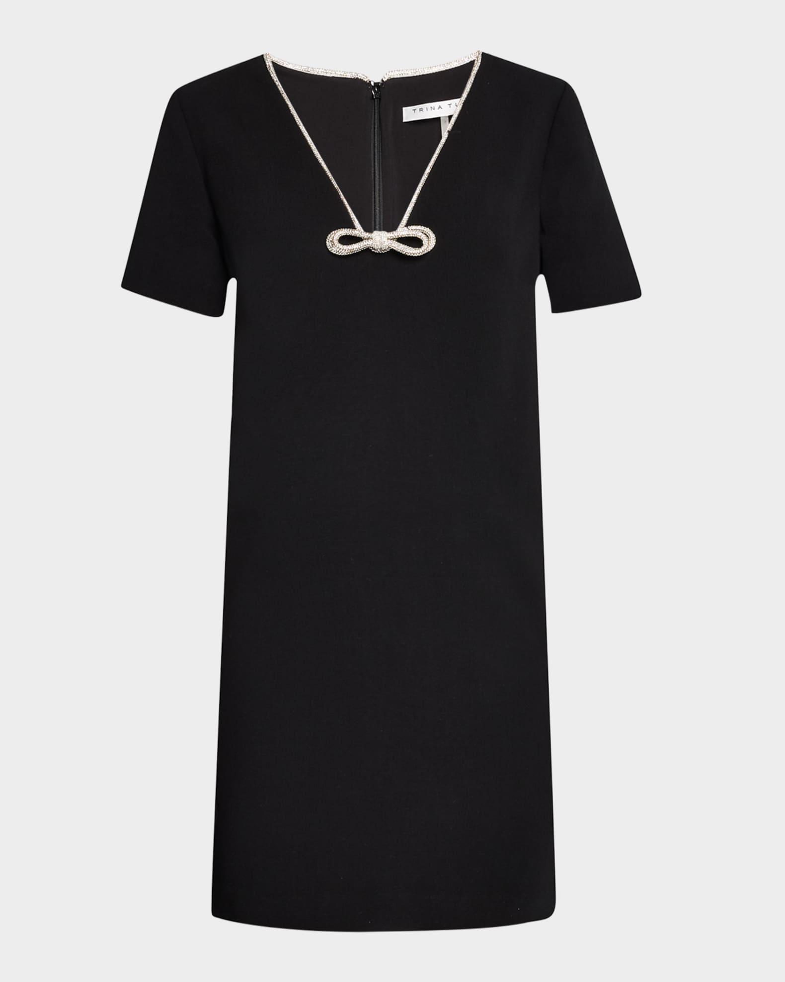 Trina Turk "Obelle" mini dress with contrast shimmer trim and front bow Approx. 36"L from shoulders to hem V neckline Short sleeves Hem falls above the knee A-line silhouette Invisible back zipper Polyester/viscose/spandex Imported Model is 5'10"/177cm.