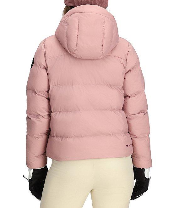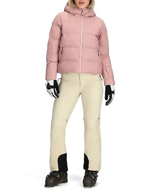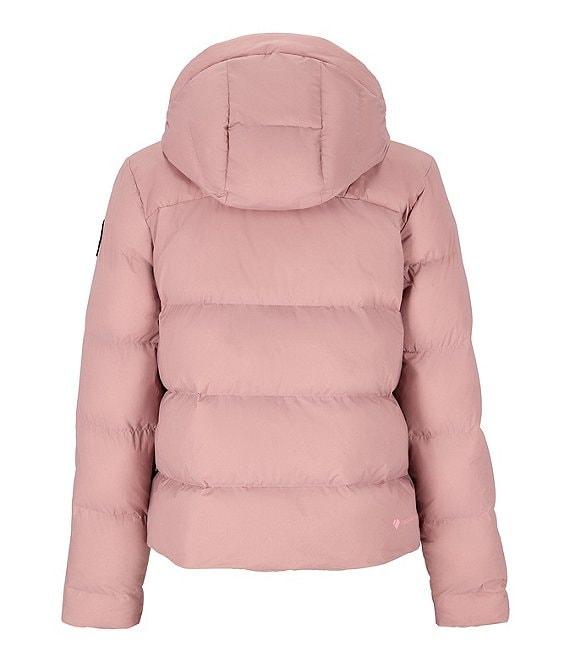From Obermeyer, this jacket features: Puffer silhouette Stand collar neckline Attached adjustable hooded Long sleeves with thumbholes inner cuffs Pass pocket interior Handwarmer pockets Snap-away powder skirt Synthetic down 600 fill power equivalent Water resistant Fully lines Straight hemline Zip front closure Approx. 22.75" length Nylon Machine wash Imported.