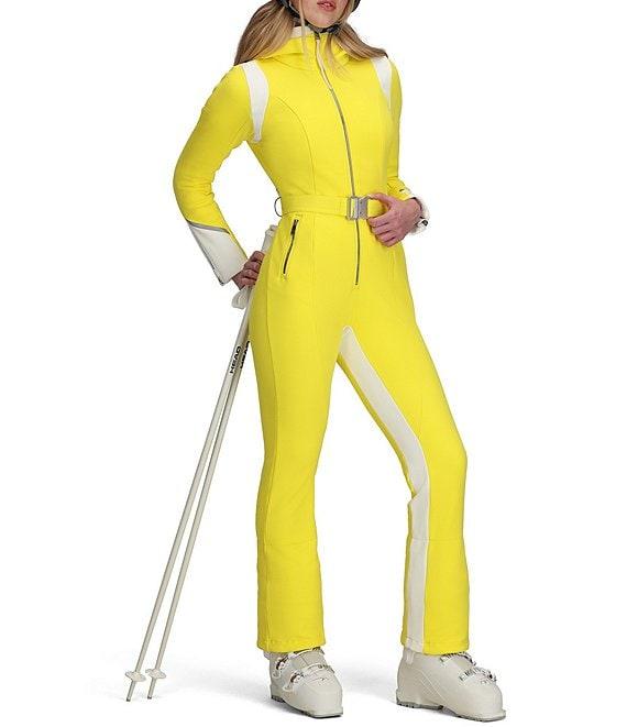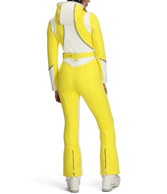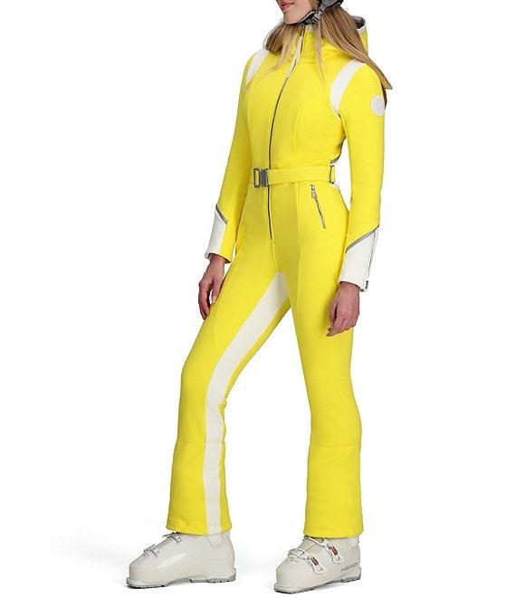 From Obermeyer, this jumpsuit features: Ski suit silhouette Stand collar neckline Attached hood Long sleeves with zip cuffs Front zip pockets Belted Water repellent Fitted fit Fully lined Zip hemline Zip front closure Polyester/elastane Machine wash Imported.