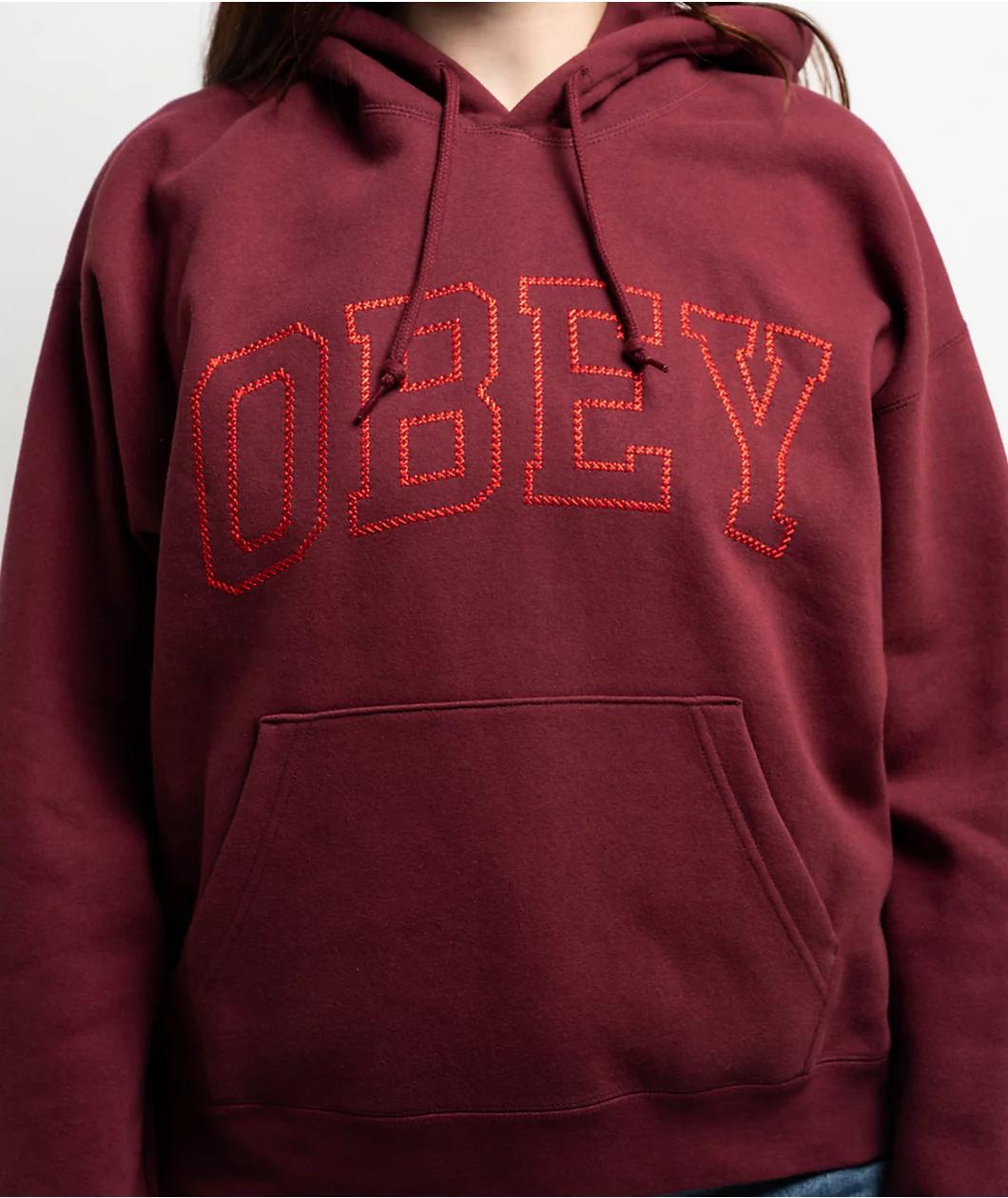 Obey introduces the Collegiate Cross Stitch hoodie in a red colorway. The perfect way to keep warm in a casual outfit, the hooded sweatshirt features branding script embroidered in a Collegiate font on the chest for a classic, sporty look. A drawstri
