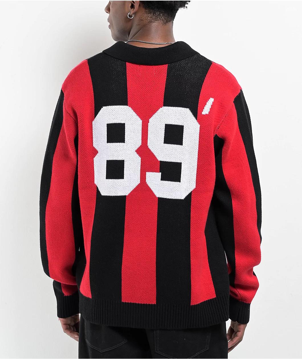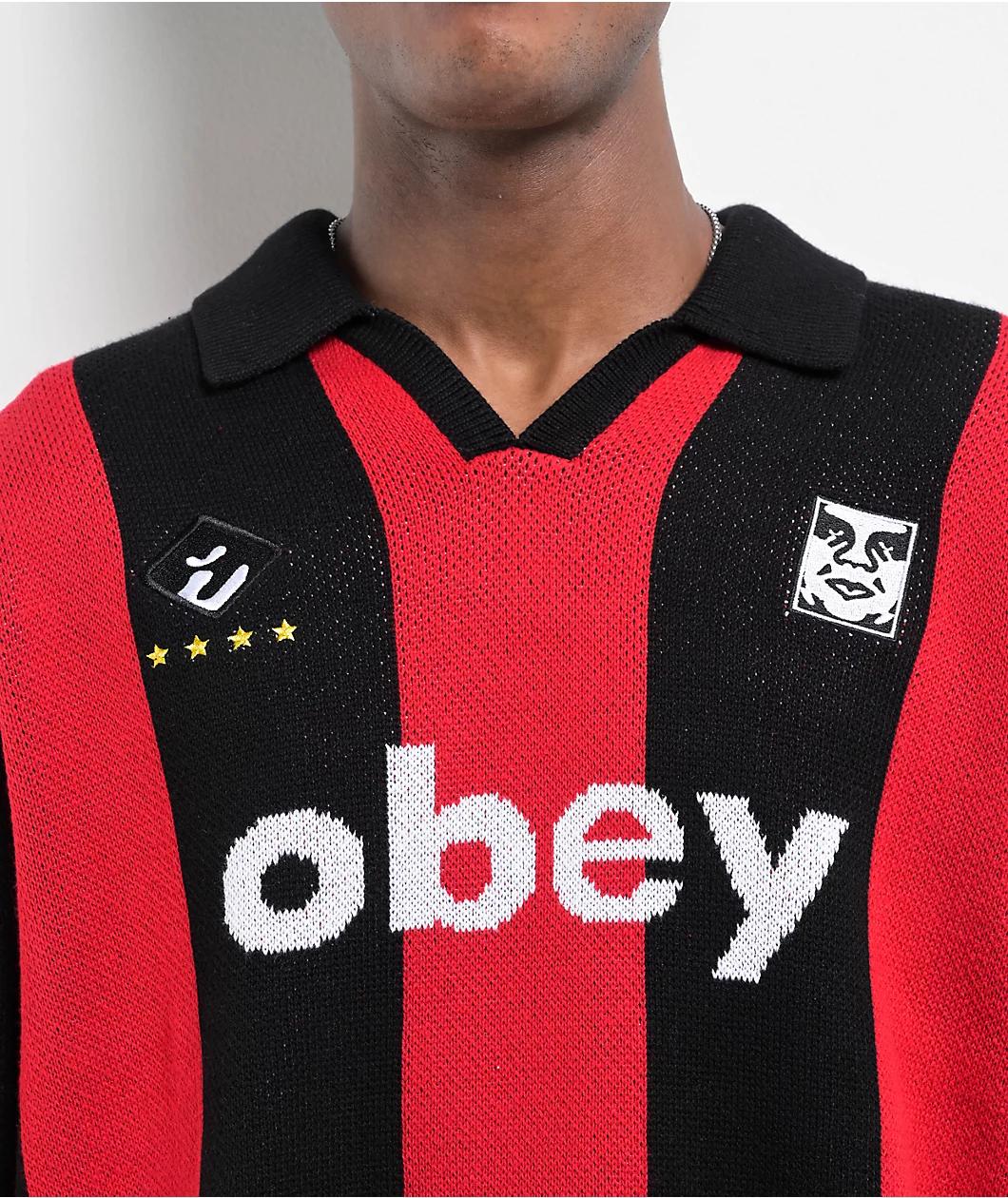 Available in a sleek black and red vertical stripe pattern from Obey, the Soccer polo sweater lands in a thick cotton construction with jacquard-knit detailing and embroidered graphics. Following a classic athletic uniform motif, the long sleeve pull