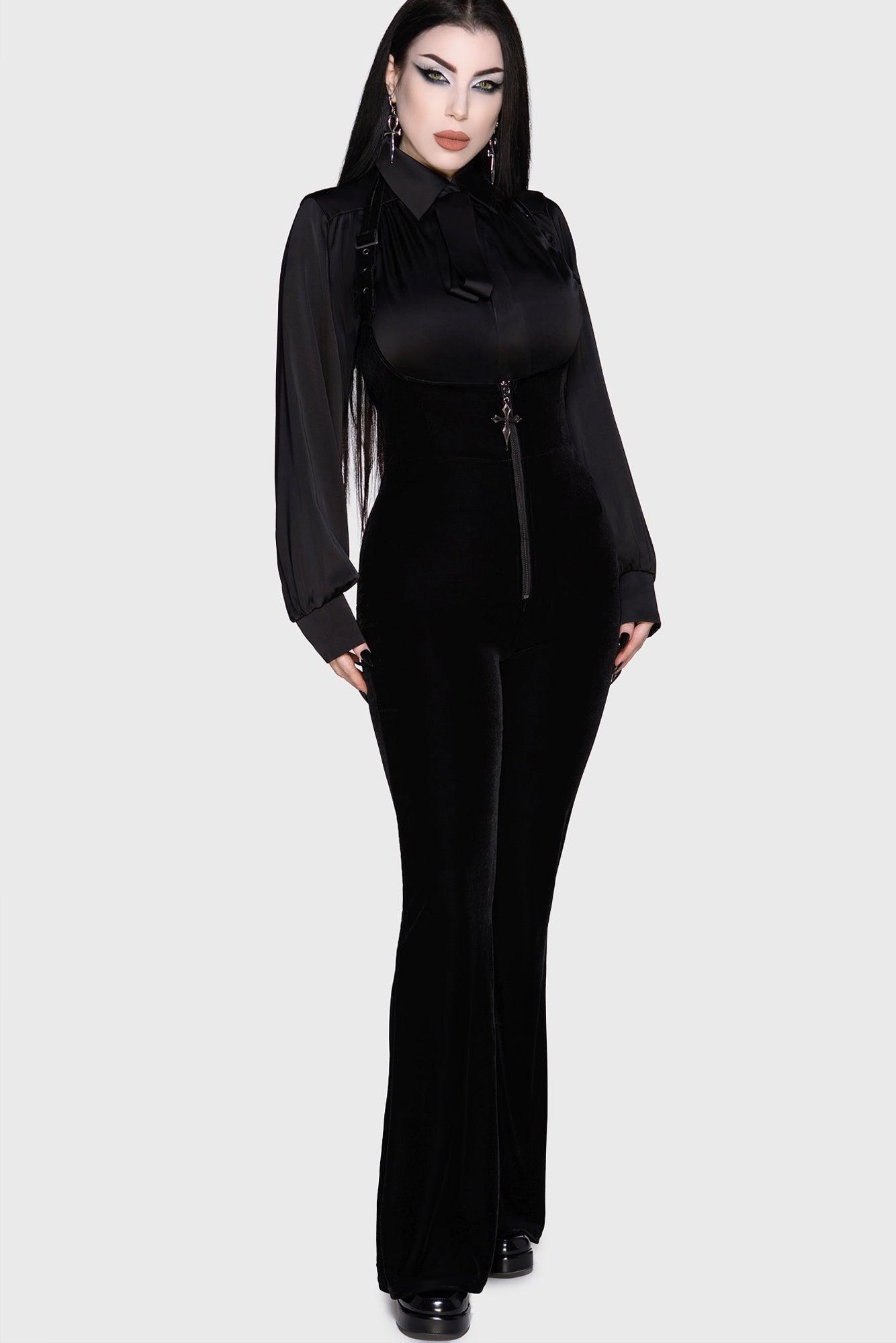 OBSCURELLA.- Soft, stretch velvet.- Adjustable shoulder straps.- Underbust style.- Flared.- Front zip closure.- Statement cross zip puller.- Fitted.With KILLSTAR branding, 95% Polyester 5% Elastane.Hand wash delicate (30°c) / Do not bleach / Do not tumble dry /Do not iron / Do not dry clean. Imported.