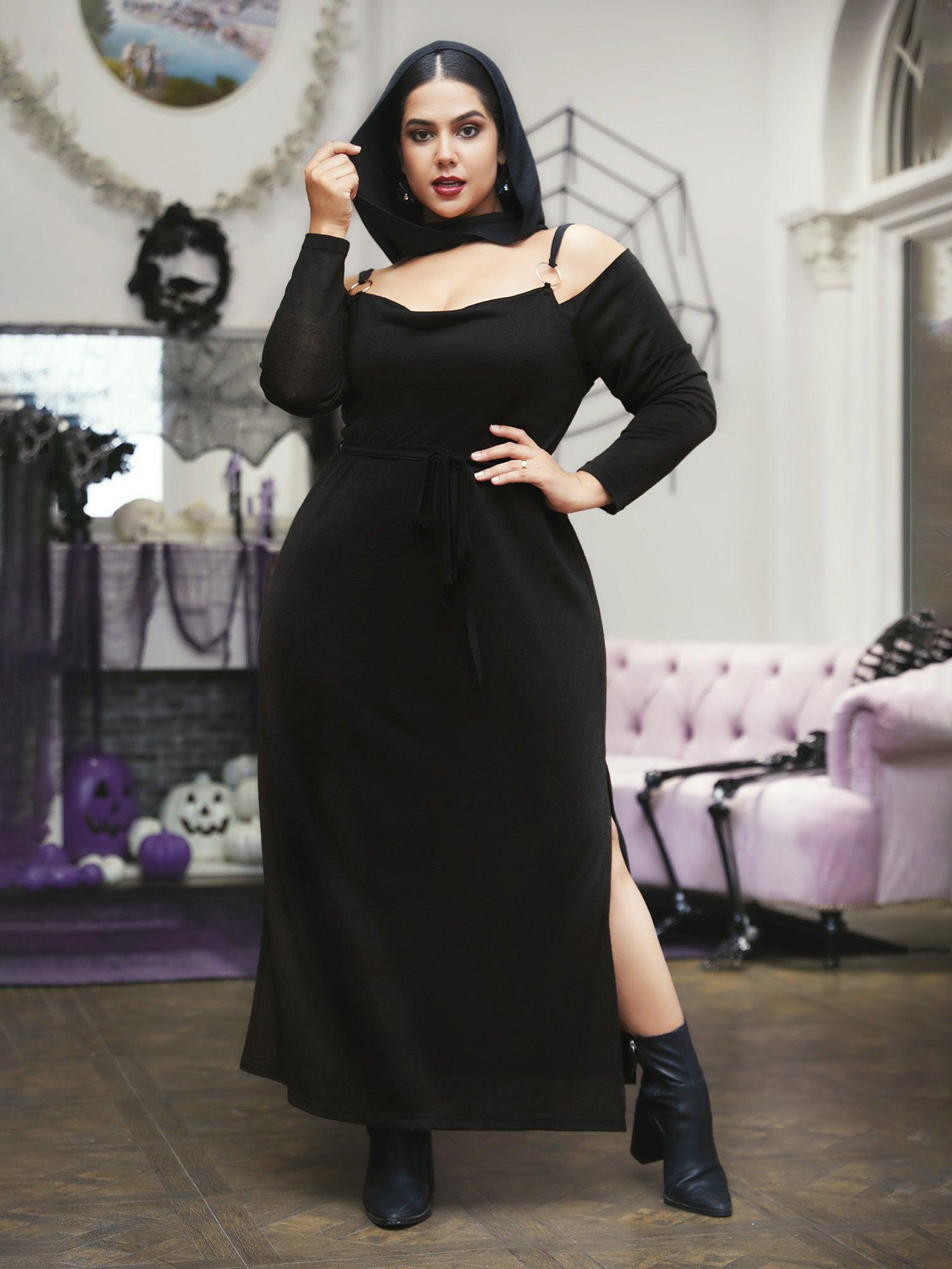 Shop Obsidian Side Slit Accents Maxi Dress now and redefine your style with confidence at BloomChic. Tailored for mid and plus-size women. This trendy Dresses Women, sizes 10-30. Season:Winter;Color:Black;Style:Cocktail;Neckline:Hooded;Sleeve Type:Regular Sleeve;Prints:Non;Details:Belted, Slit;Pocket:No-pocket;Belt:Belt;Closure Type:Non