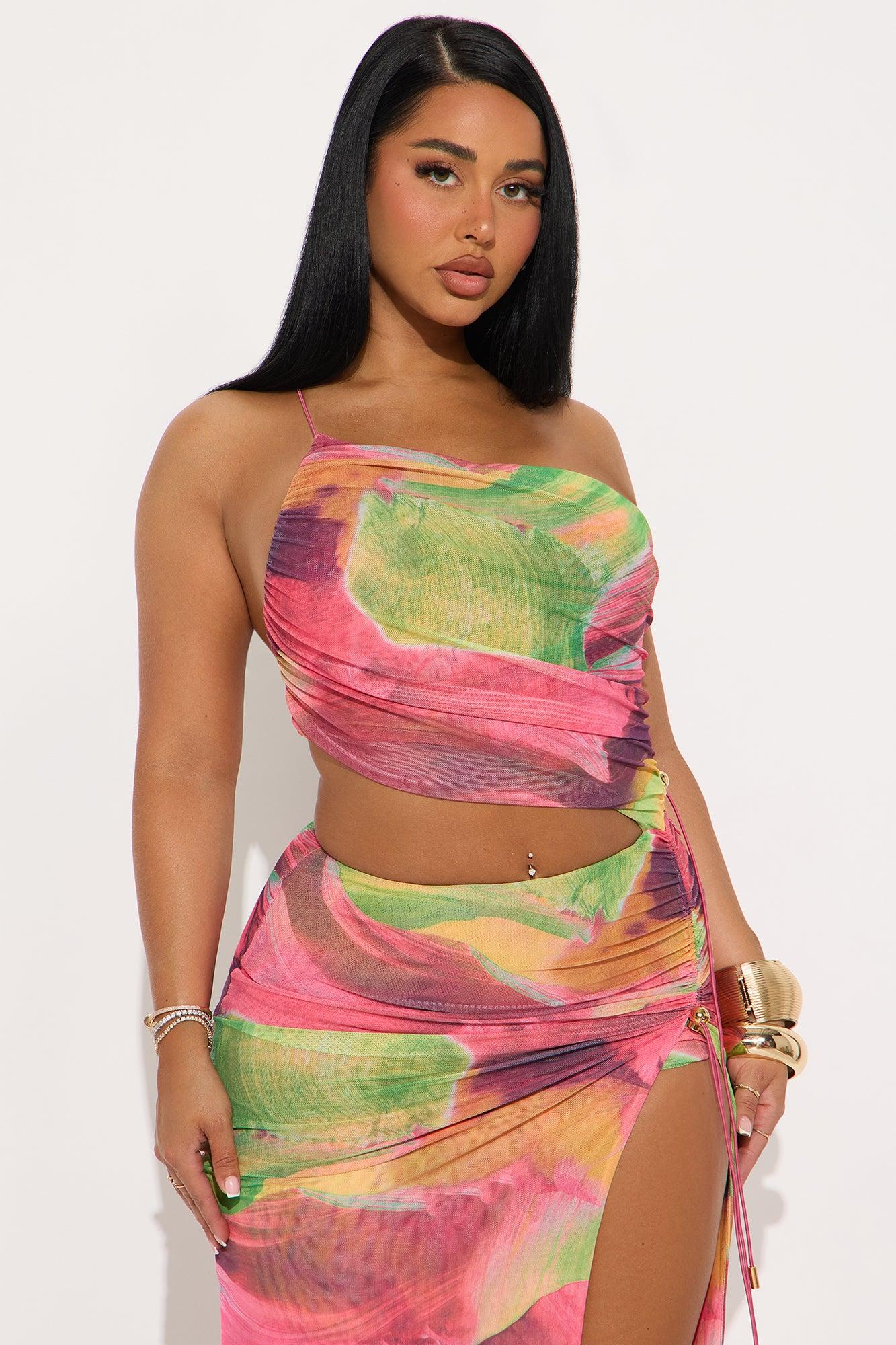 Available In Multi Color. Mesh Maxi Dress One Shoulder Bungee Straps Ruched Cut Out Adjustable High Slit Strappy Back Hidden Side Zipper Lined Stretch Disclaimer: Due To The Printing Process A Difference In Saturation May Occur. Each Garment Is Unique. Print Placement Will Vary. Self: 95% Polyester 5% Spandex Imported