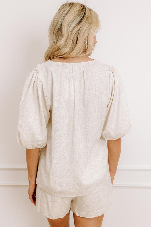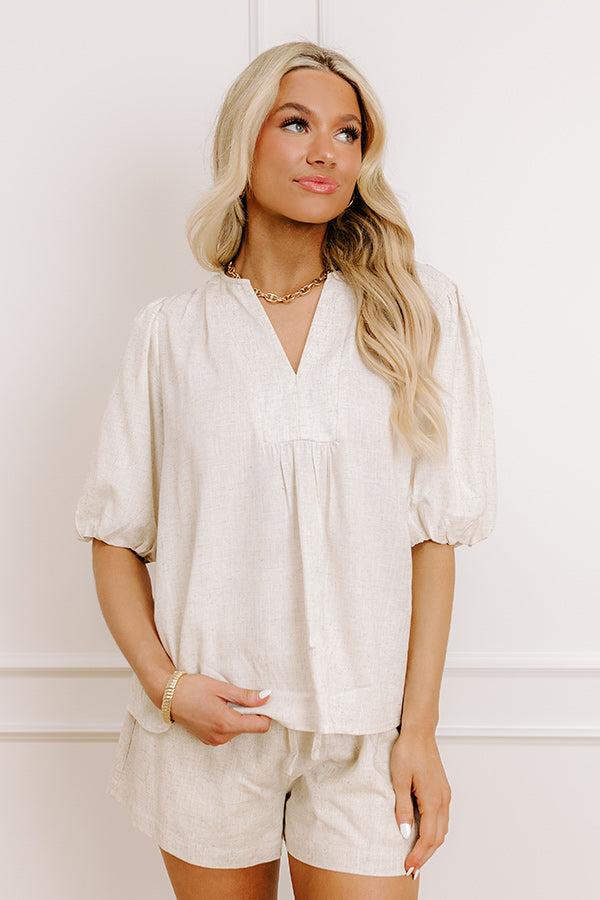 - This linen blend top is your go-to for cute, chic style on sunny days! Light, breezy, and perfect for casual warm weather outings. - Unlined linen blend material - A v-cut neckline - Short sleeves with elastic cuffs - A relaxed silhouette that ends in a straight hemline