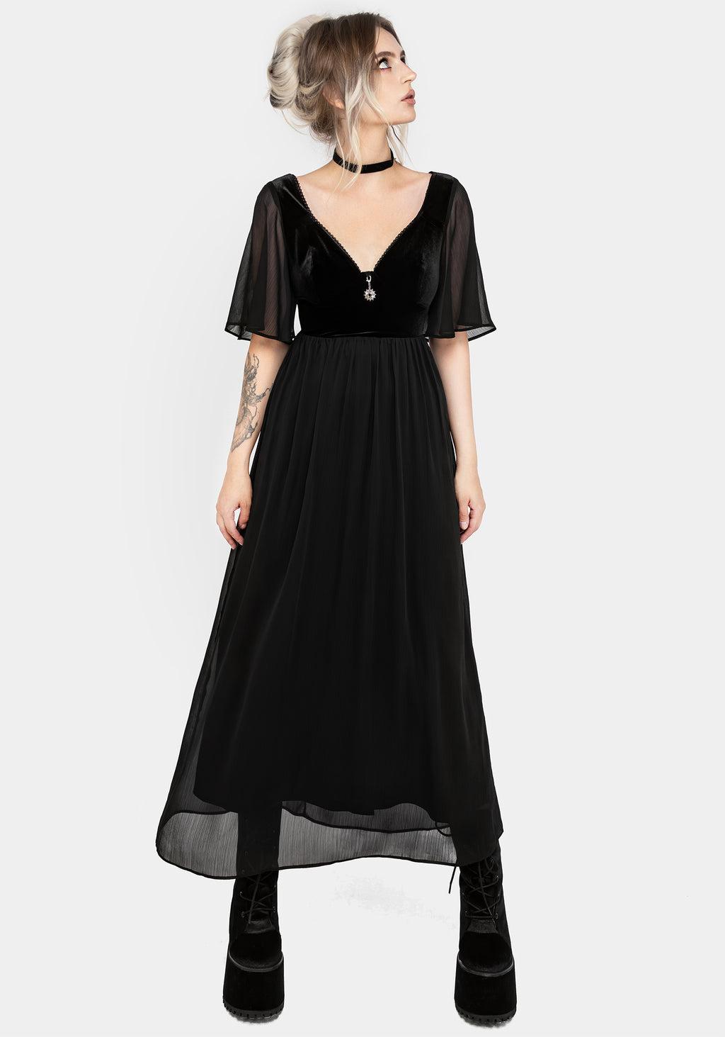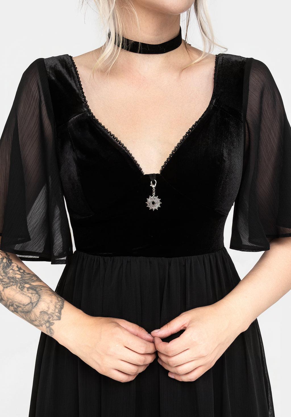 See it all- Black velour & chiffon angel sleeve maxi dress - Flattering fit ‘n’ flare shape in a maxi length - Romantic scallop-trim sweetheart neckline with floaty sheer angel sleeves - Concealed side zipper for easy dressing - Luxe velour bodice with silky sheer chiffon sleeves & skirt - Solid black midi-length skirt lining - Silver eye-charm with black gem at centre hangs from neckline (remove for washing) - A beauty that must be seen to be believed! Main: 100% polyesterContrast: 100% polyesterLining: 95% polyester, 5% elastane