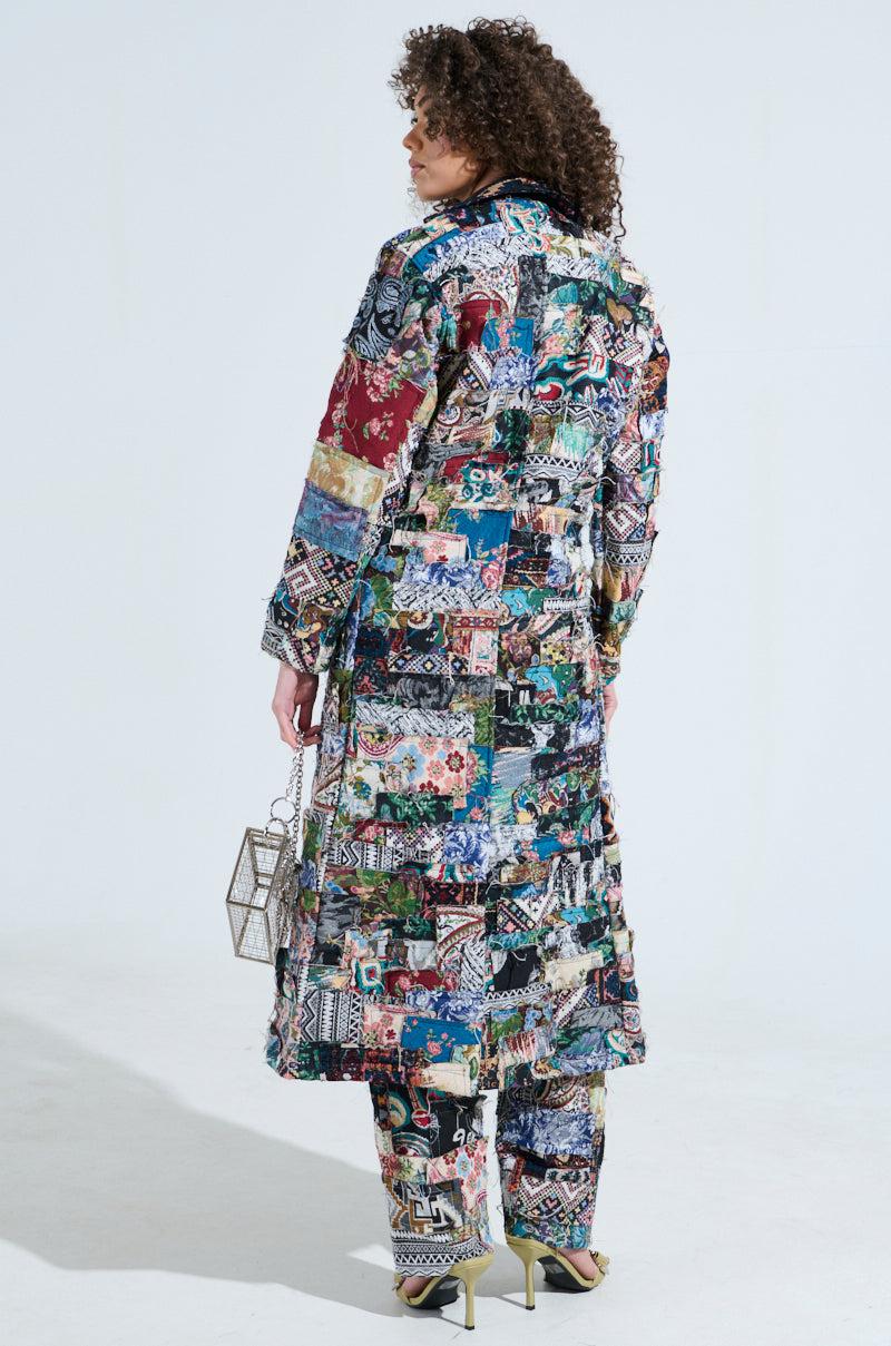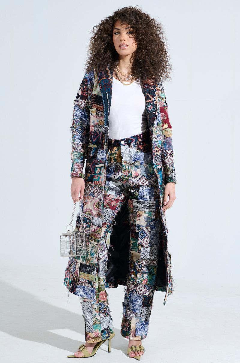 The AKIRA Label Odessa Patchwork Trench will have you turn heads. This eccentric jacket is crafted from a structured, tapestry-inspired material and features a patchwork design of earthy-colored prints and patterns with distressed detailing throughout, a notch lapel collar, long sleeves, two cargo waist pockets, a back vent slit for extra mobility, and a silky inner lining. Complete with metallic embossed button front closures, and a relaxed, longline silhouette. Pair it with the coordinating AKIRA Label Odessa Relaxed Fit Patchwork Pants, a turtle neck sweater, and stiletto booties for a chic finish. - 95% Polyester 5% Cotton- No Stretch- Imported (all measurements approximate from size small)- 52” Shoulder to Hem- 16” Shoulder to Shoulder- 23” Sleeves- Model is 5’10” and is wearing size small Product ID: 432137