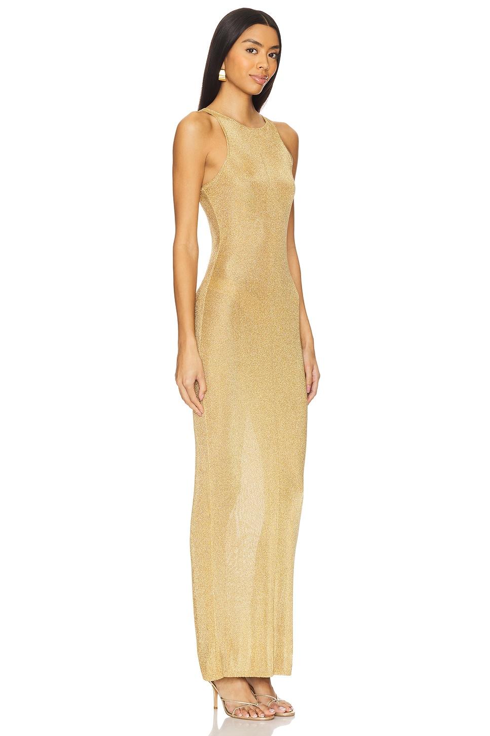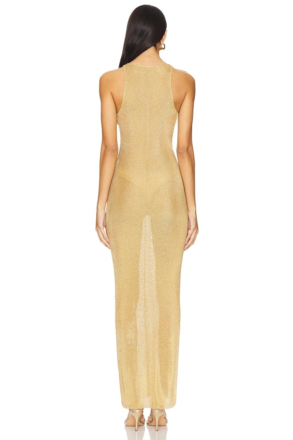 72% viscose, 28% metallic fibers. Made in China. Hand wash. Unlined. Pull-on styling. Knit fabric with metallic threading. Garment is made with a semi-sheer fabric, undergarments can show throughPlease note: Brief is included. Revolve Style No. DGUI-WD74. Manufacturer Style No. H24419S051.