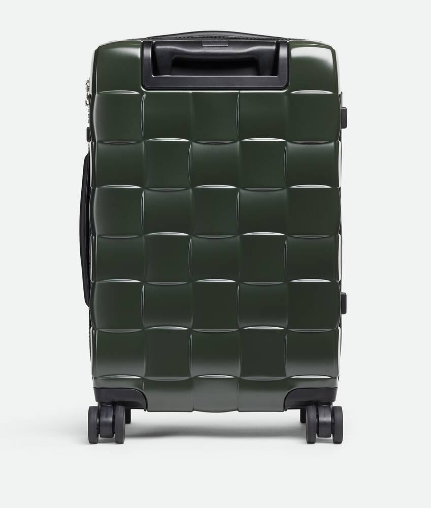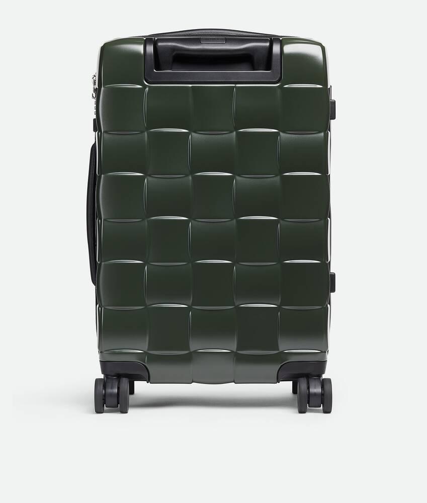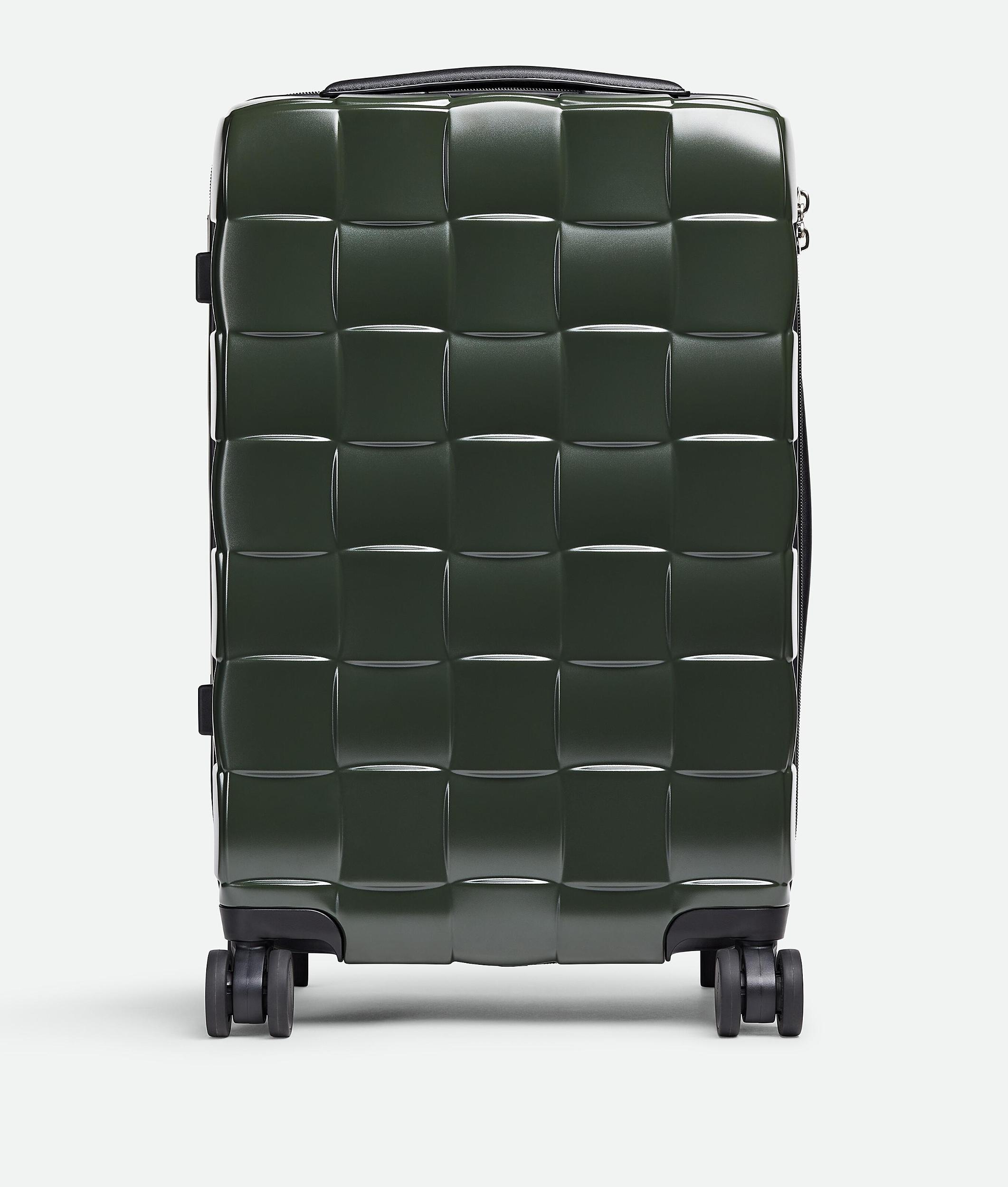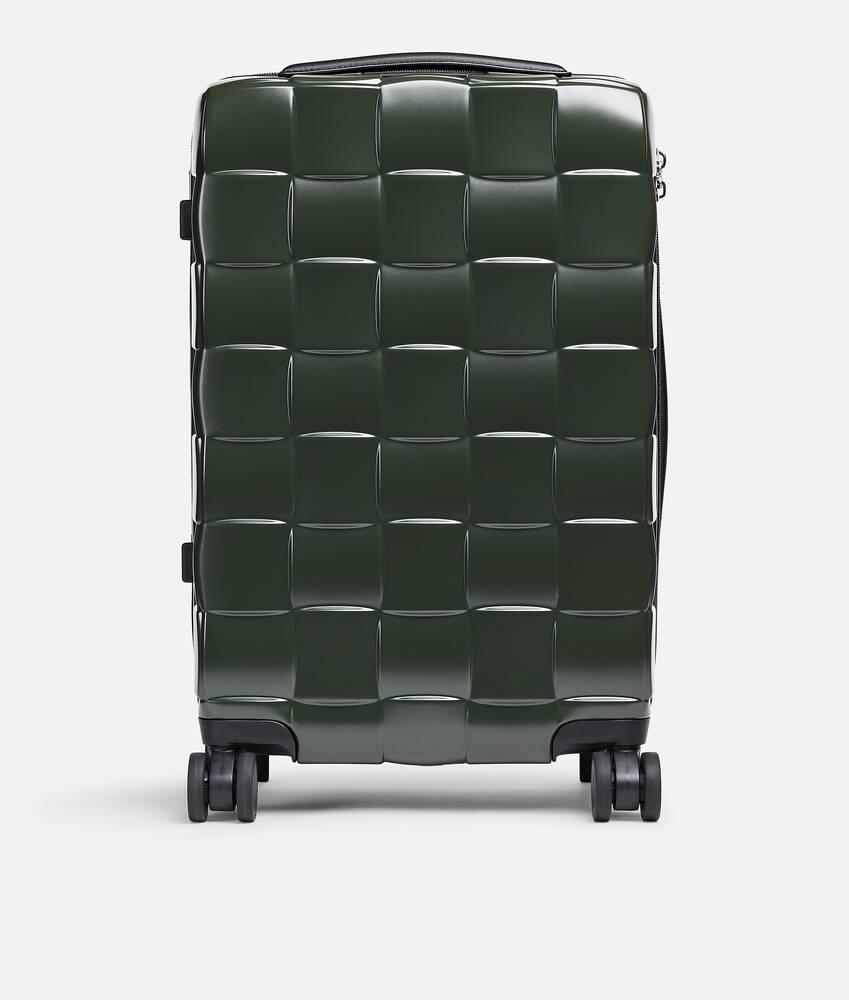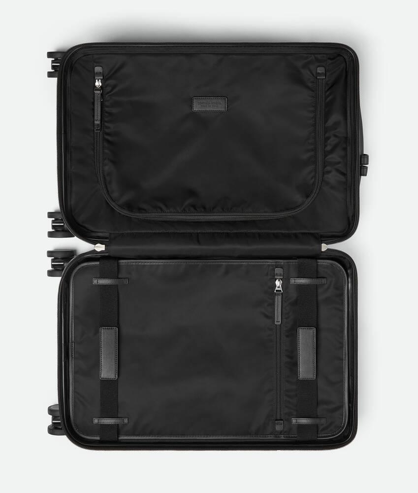• Polycarbonate trolley with thermoformed Intreccio pattern• Cabin size• Volume: 38L • Calf leather handles and trims• Detachable Intrecciato leather tag holder• One zipped compartment and one strapped compartment featuring a detachable divider with a flat zipped pocket• Zip closure with TSA compliant lock system• Four 360° wheels and telescopic handle