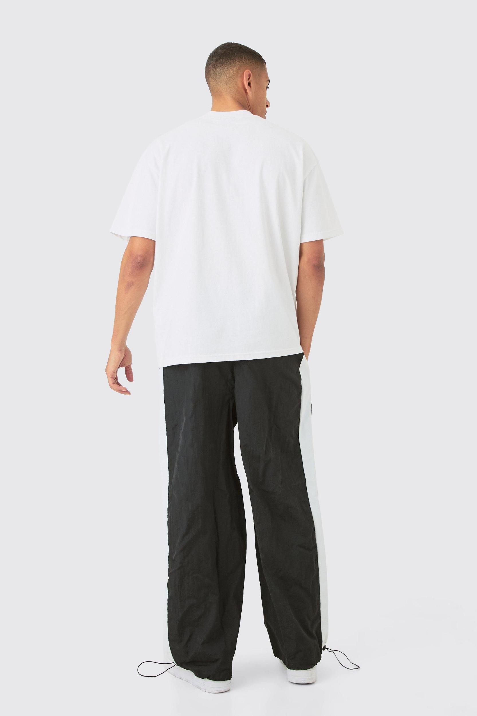 Mens Black OFCL Side Panel Parachute Pants - Swap your denim for trousers for extra style points. Put aside your jeans for a day and go for a pared down but at the same time casually dapper option with our collection of mens trousers. Youll be surprised at how easy is for any gent to look polished and sharp in a pair of smart pants and a cool top. Choose chinos or suit trousers for the office or formal occasions, and complete your ensemble with a nice shirt. For a night out with the lads, show some serious street style skills in cargo pants or cropped trousers. Pair them with a graphic tee and high-top trainers for extra style points.