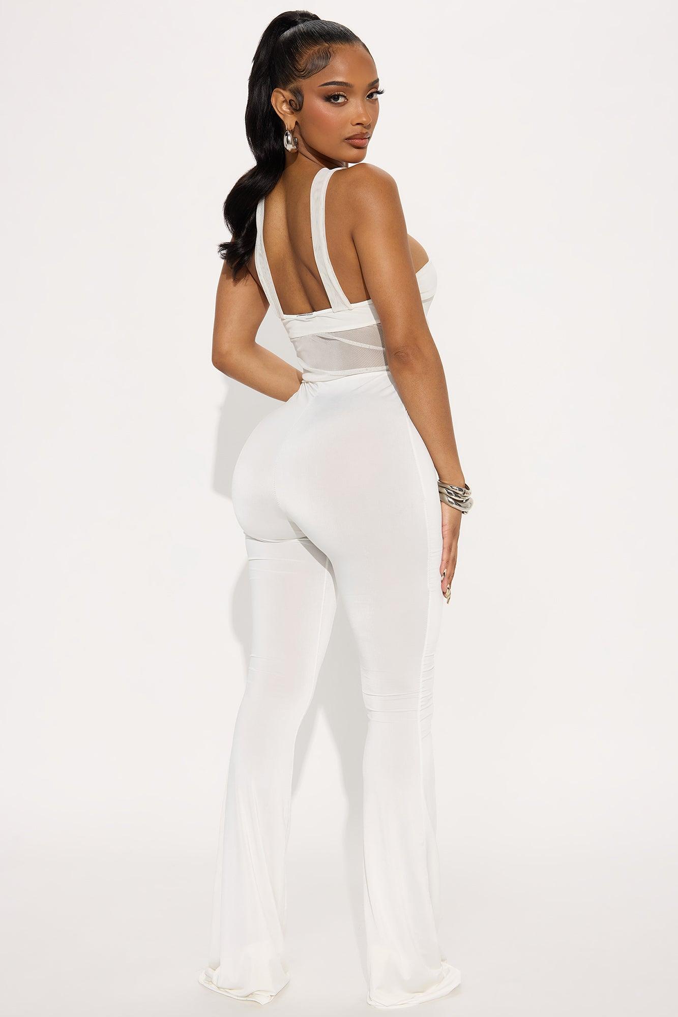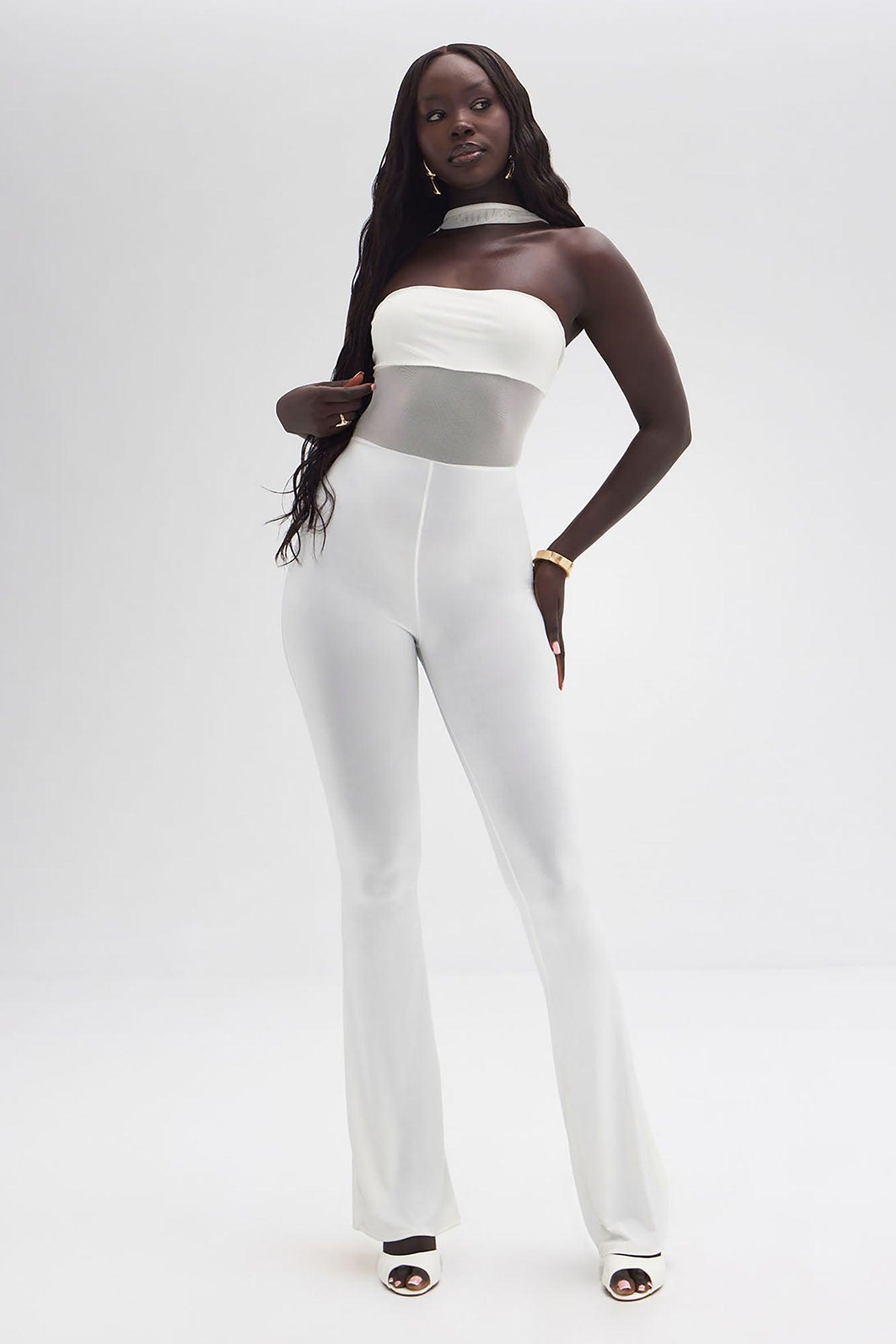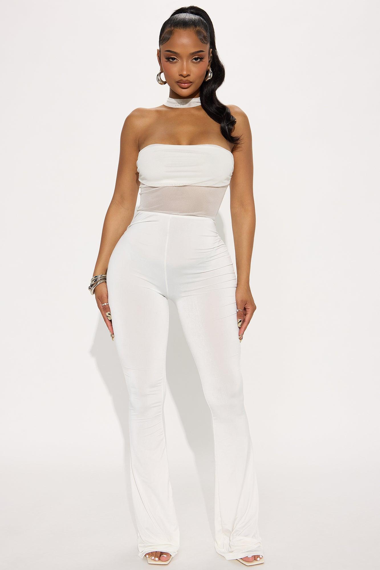 Available In Black And White. Jumpsuit Stretch Choker Detail Flare Leg Inseam = 35" Self: 95% Polyester 5%Spandex Contrast: 95% Polyester 5% Spandex Imported California Proposition 65WARNING: Cancer and Reproductive Harm - www.P65Warnings.ca.gov.