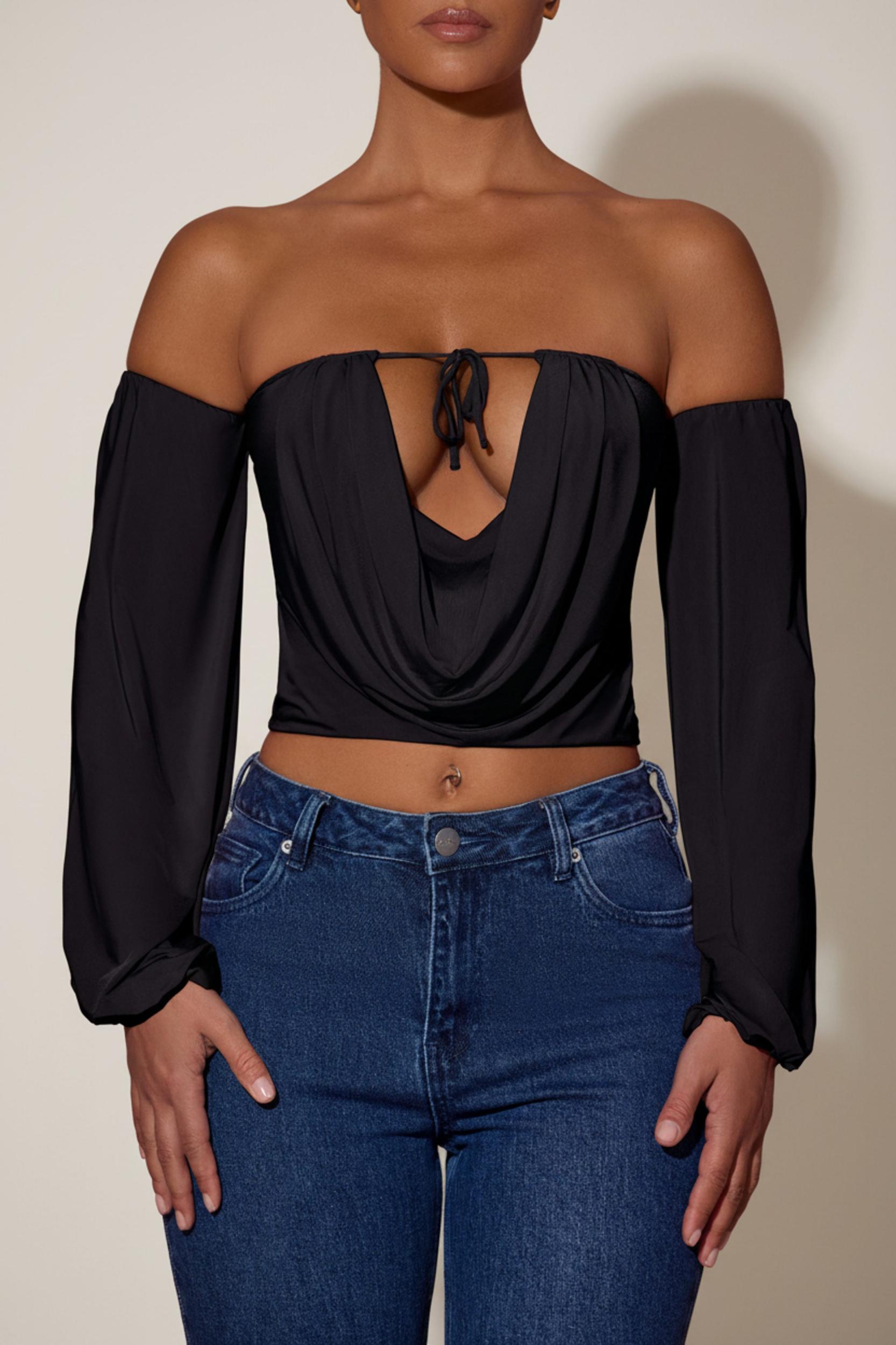 A style you’ll always adore, the Juliana top is crafted from our premium, soft and stretchy sheer jersey with a slinky jersey lining for the perfect amount of coverage. It’s cut to a figure-hugging silhouette with a plunging cowl neckline, secured with internal silicone tape for enhanced hold. It’s framed with dramatic off-shoulder balloon sleeves and features adjustable rouleau ties at the front for custom styling.Bandeau neckOff-shoulder long balloon sleevesPlunge keyhole cut-out at front with cowl panelAdjustable rouleau ties at frontPull-on designFull length, SNP to hem approx. 48cm based on a size SProduct code: 13580