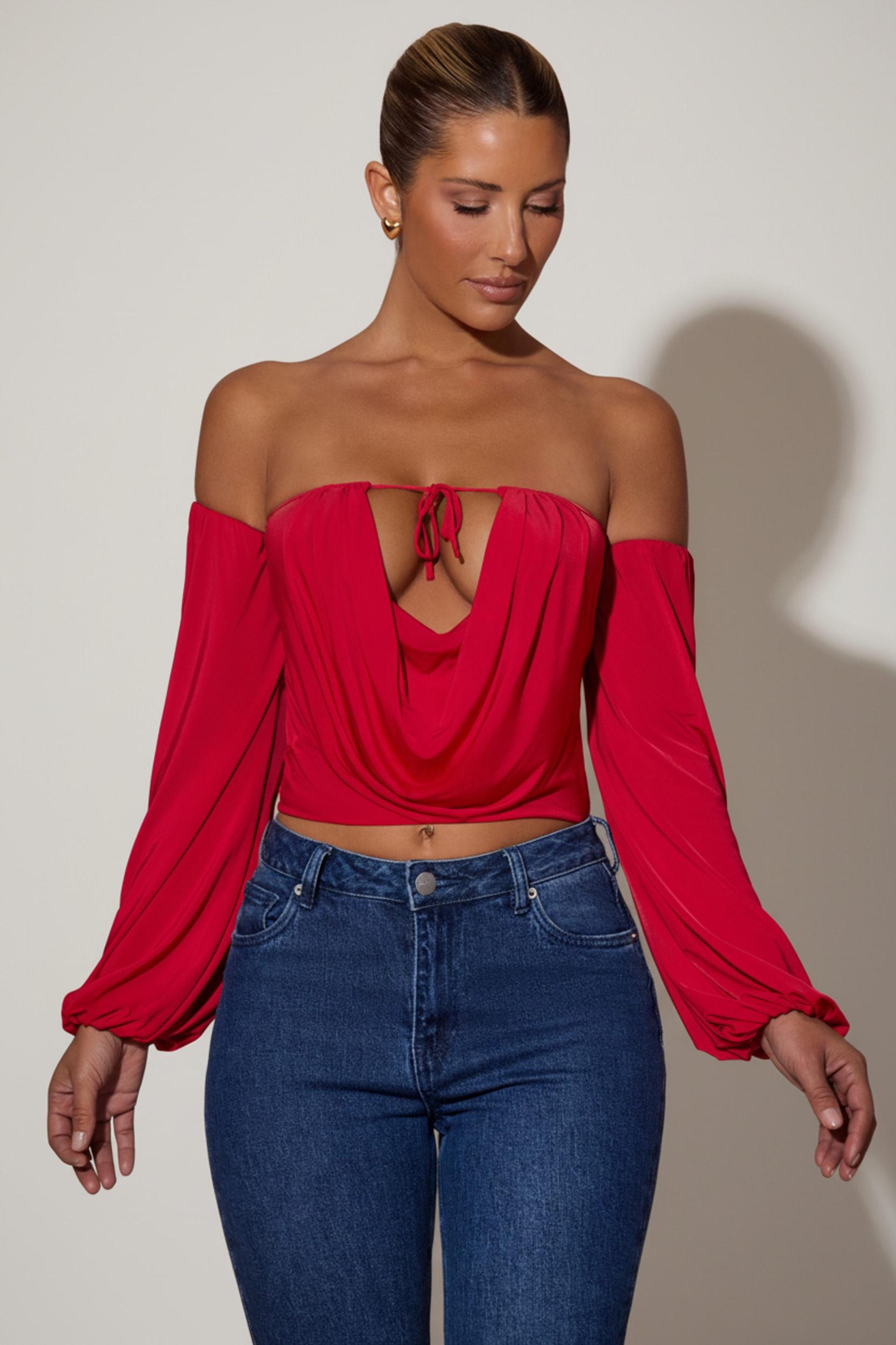 A style you’ll always adore, the Juliana top is crafted from our premium, soft and stretchy sheer jersey with a slinky jersey lining for the perfect amount of coverage. It’s cut to a figure-hugging silhouette with a plunging cowl neckline, secured with internal silicone tape for enhanced hold. It’s framed with dramatic off-shoulder balloon sleeves and features adjustable rouleau ties at the front for custom styling.Bandeau neckOff-shoulder long balloon sleevesPlunge keyhole cut-out at front with cowl panelAdjustable rouleau ties at frontPull-on designFull length, SNP to hem approx. 48cm based on a size SProduct code: 13580