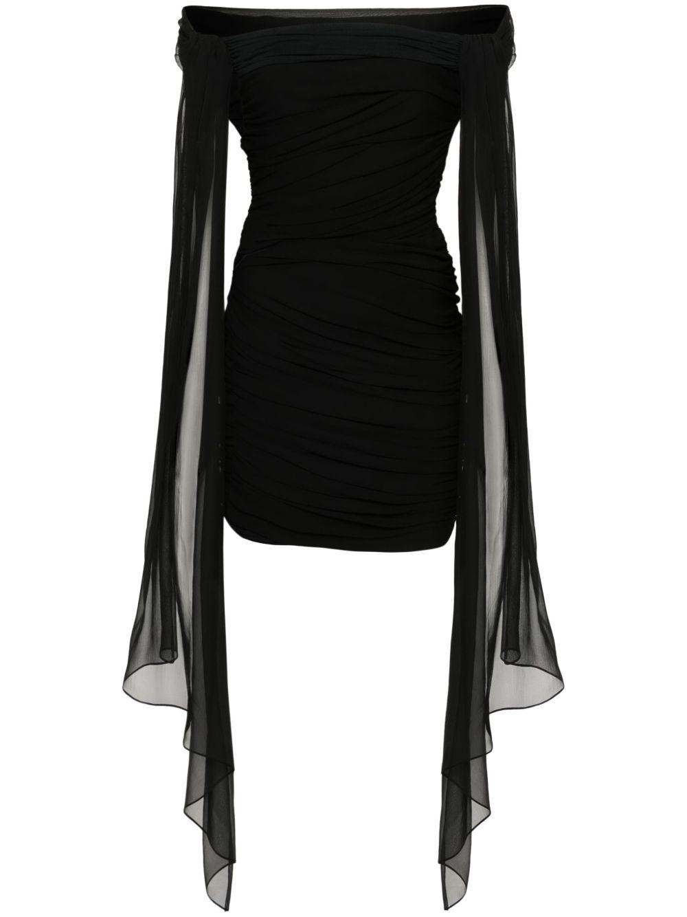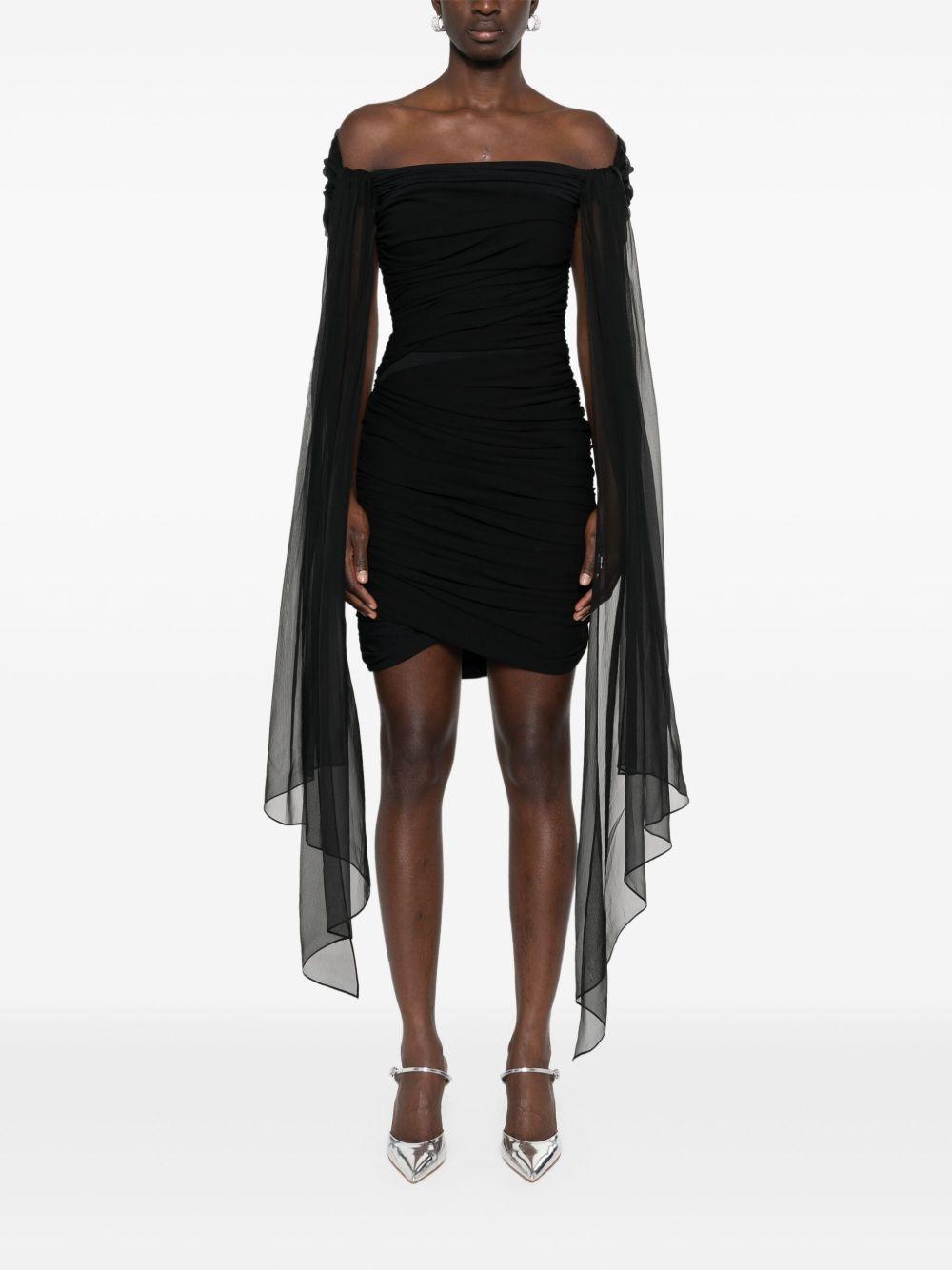 Givenchy off-shoulder draped mini dress | Black | black | stretch-jersey | draped design | semi-sheer panels | off-shoulder | short sleeves | sash detail | thigh-length | full lining | asymmetric hem | concealed side zip fastening | Viscose/Elastane/Polyamide/Elastane | Cocktail & Party Dresses | Dresses | Clothing | Women