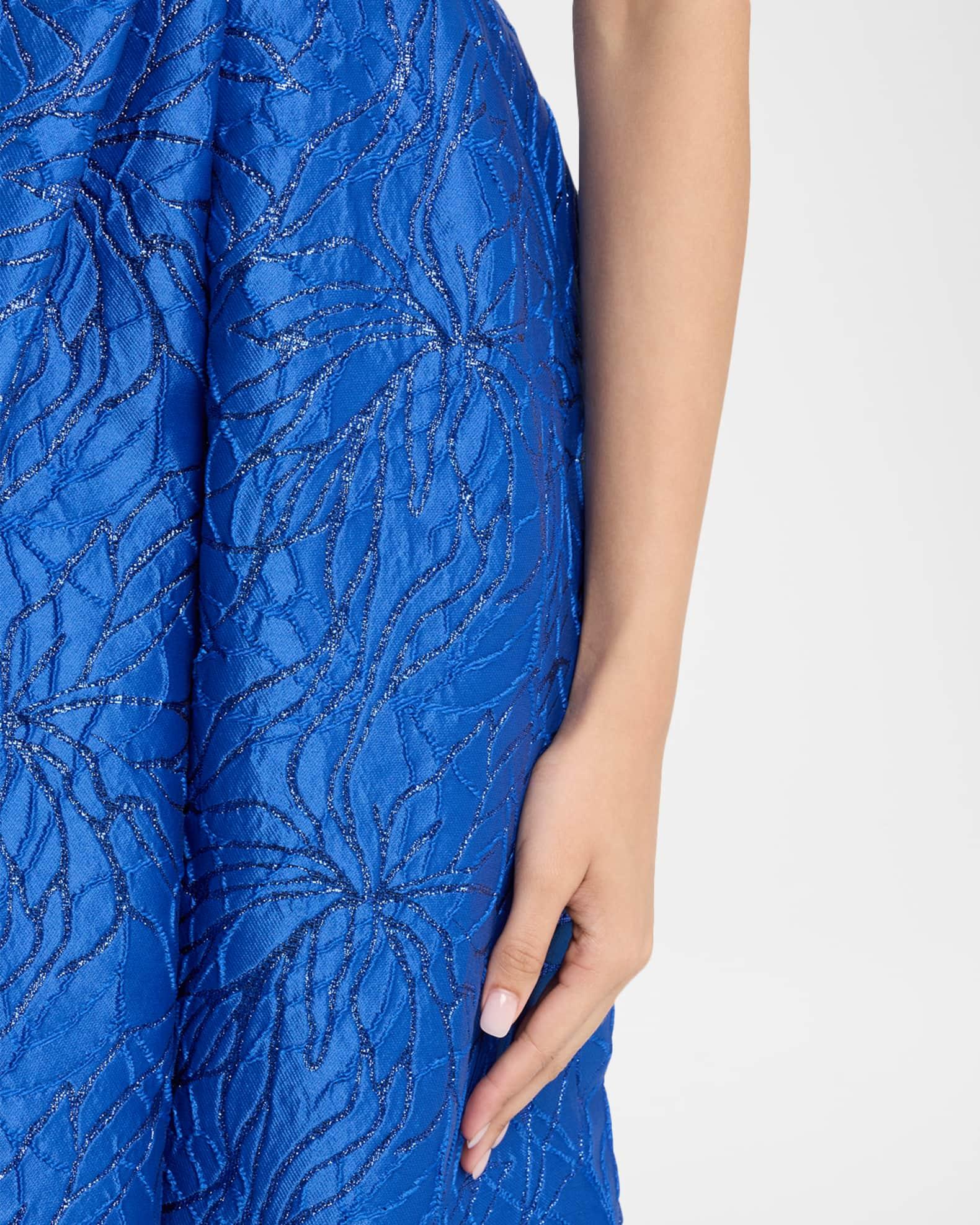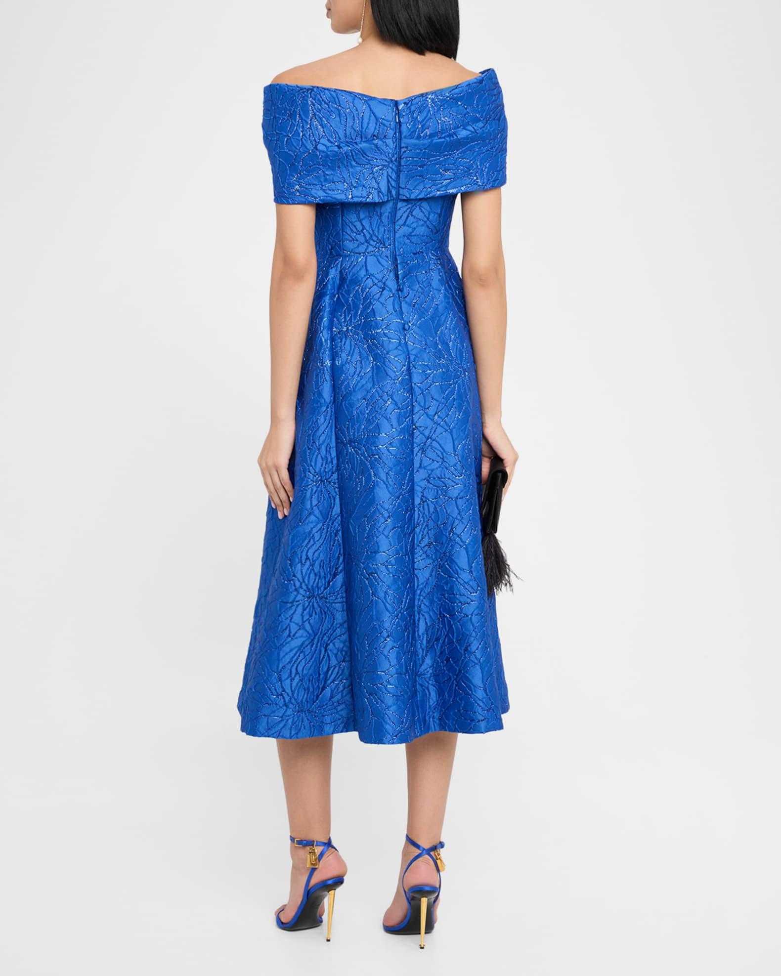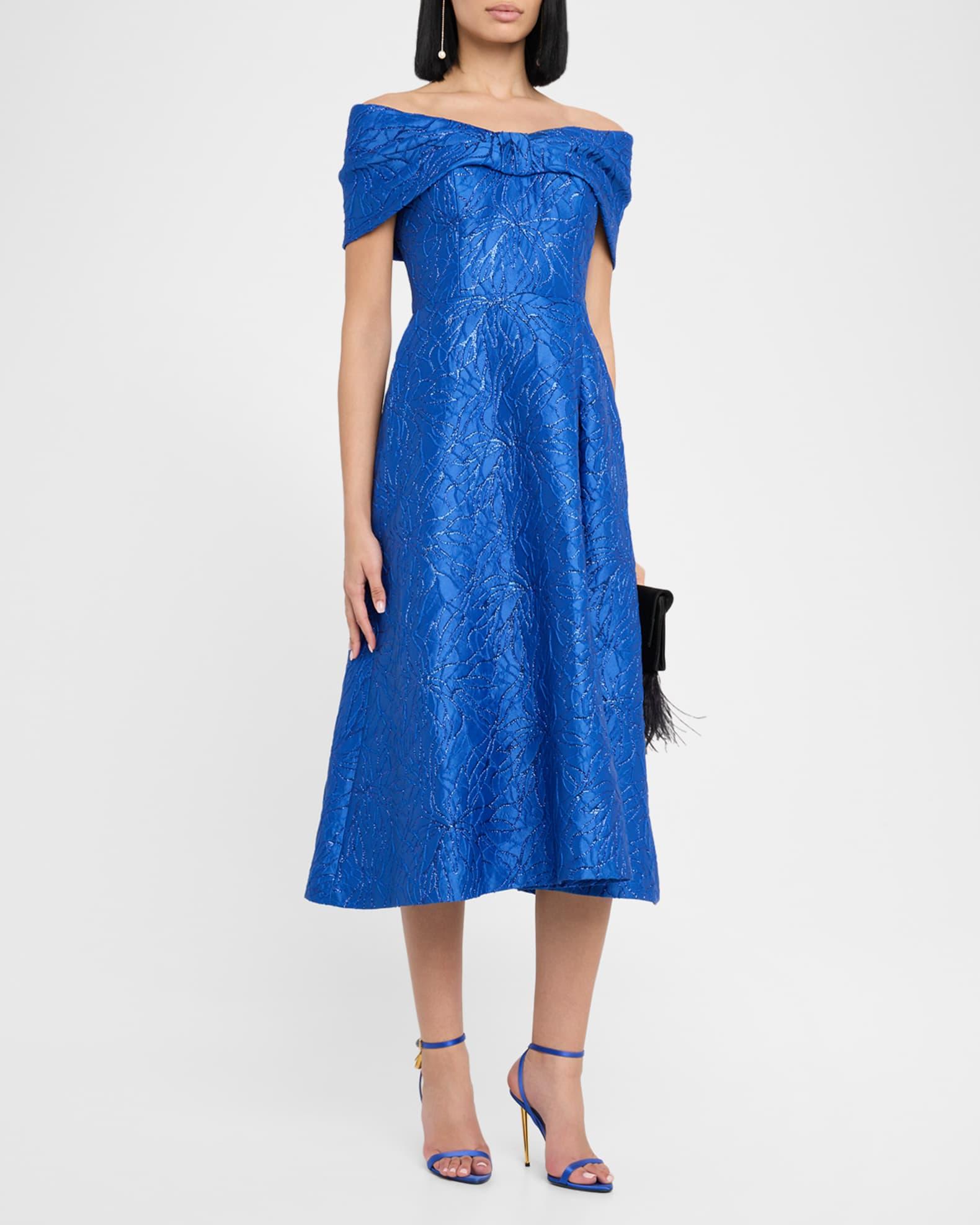 Rickie Freeman for Teri Jon pleated midi dress crafted in glittering floral jacquard Approx. 49"L from shoulders to hem Off-the-shoulder neckline Short sleeves Hem falls below the knee A-line silhouette Invisible back zipper Polyester Imported