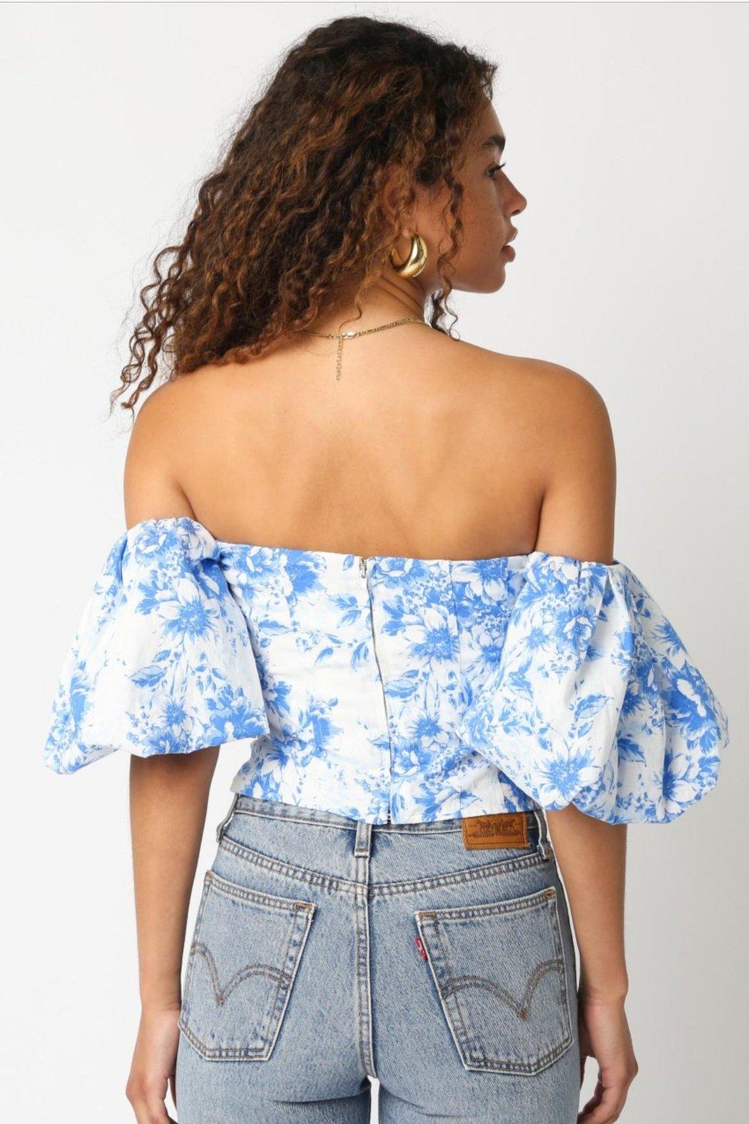 Linen blend off shoulder floral top. Model is wearing a size Small