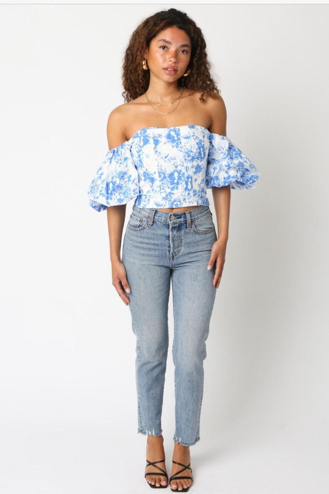 Blue Ruffle Off Shoulder Flounce Sleeve Floral Blouse