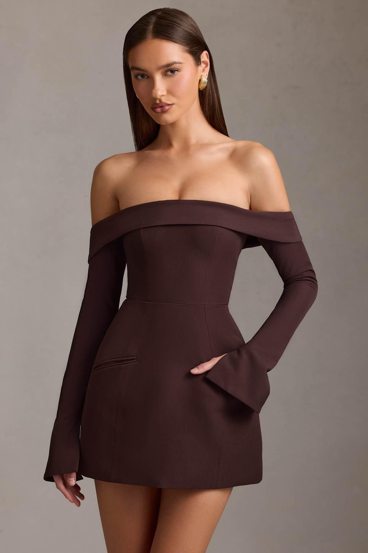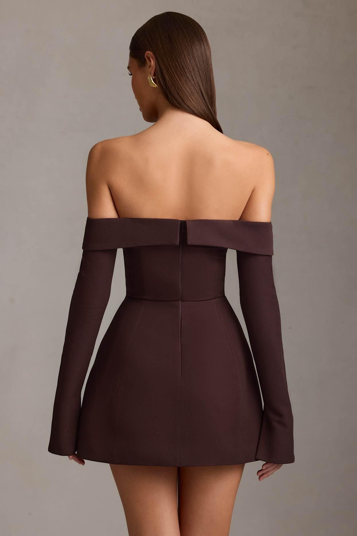 Our take on tailoring. Timeless with a signature twist, the Seraphina mini dress is crafted from sculpting stretch suiting fabric and features a fitted bodice that cinches the smallest part of your waist, then flares to a structured tulip silhouette for maximum impact. It’s framed with a foldover neckline and off-shoulder long sleeves with split cuffs.Bardot neckOff-shoulder long sleeves with split cuffsContouring seam detailingTwo slip pockets at frontConcealed rear zip fasteningStructured tulip silhouetteMini length, SNP to hem approx. 82cm based on a UK size 8Product code: 13670