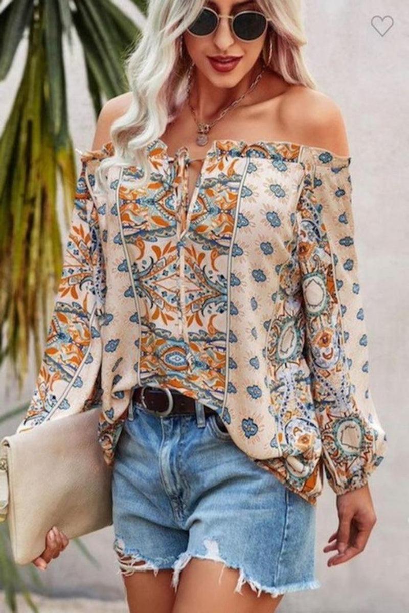 Apricot aztec print off the shoulder V neck self tie front blouse.
