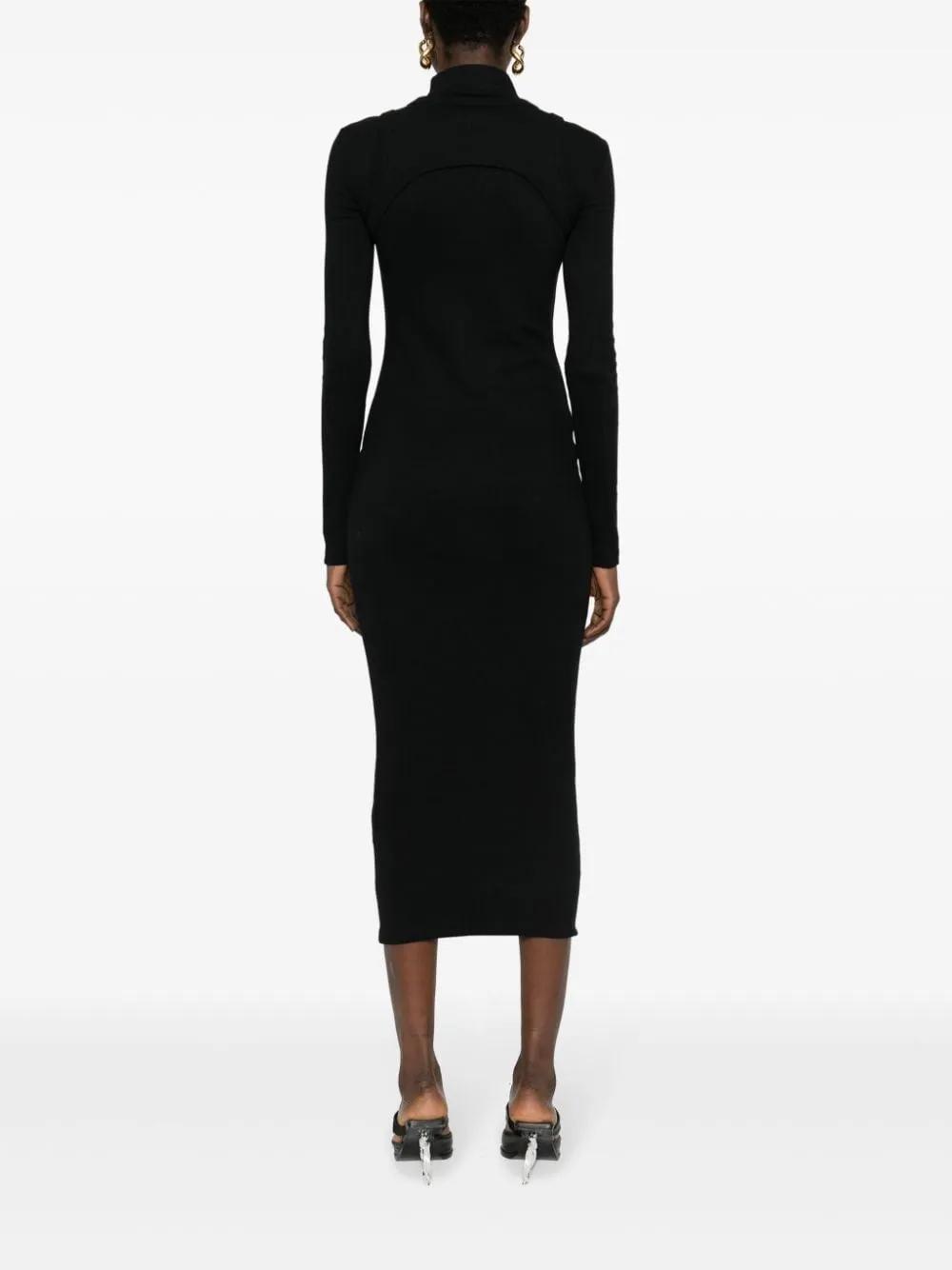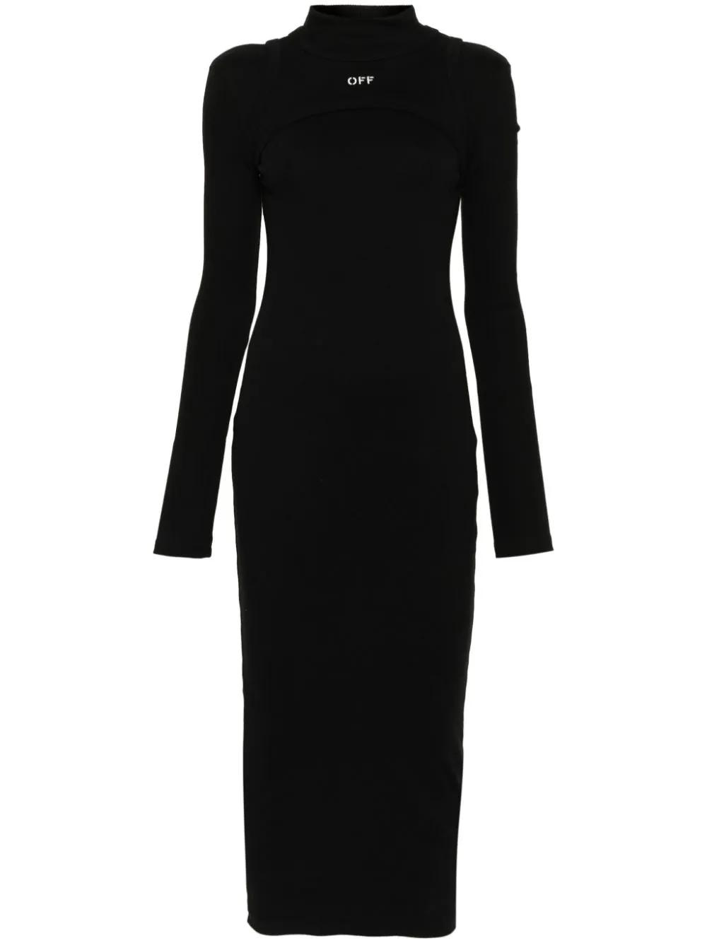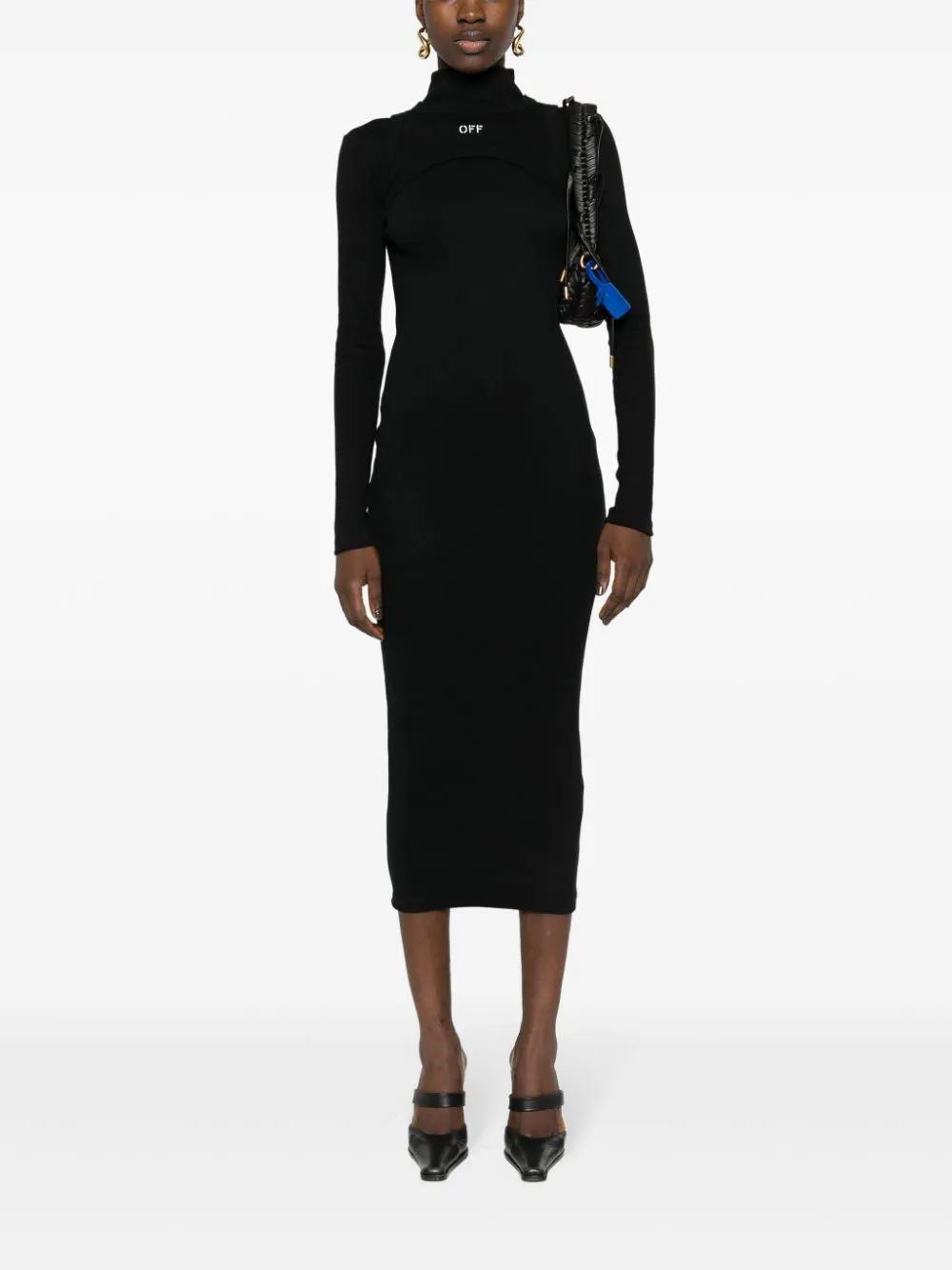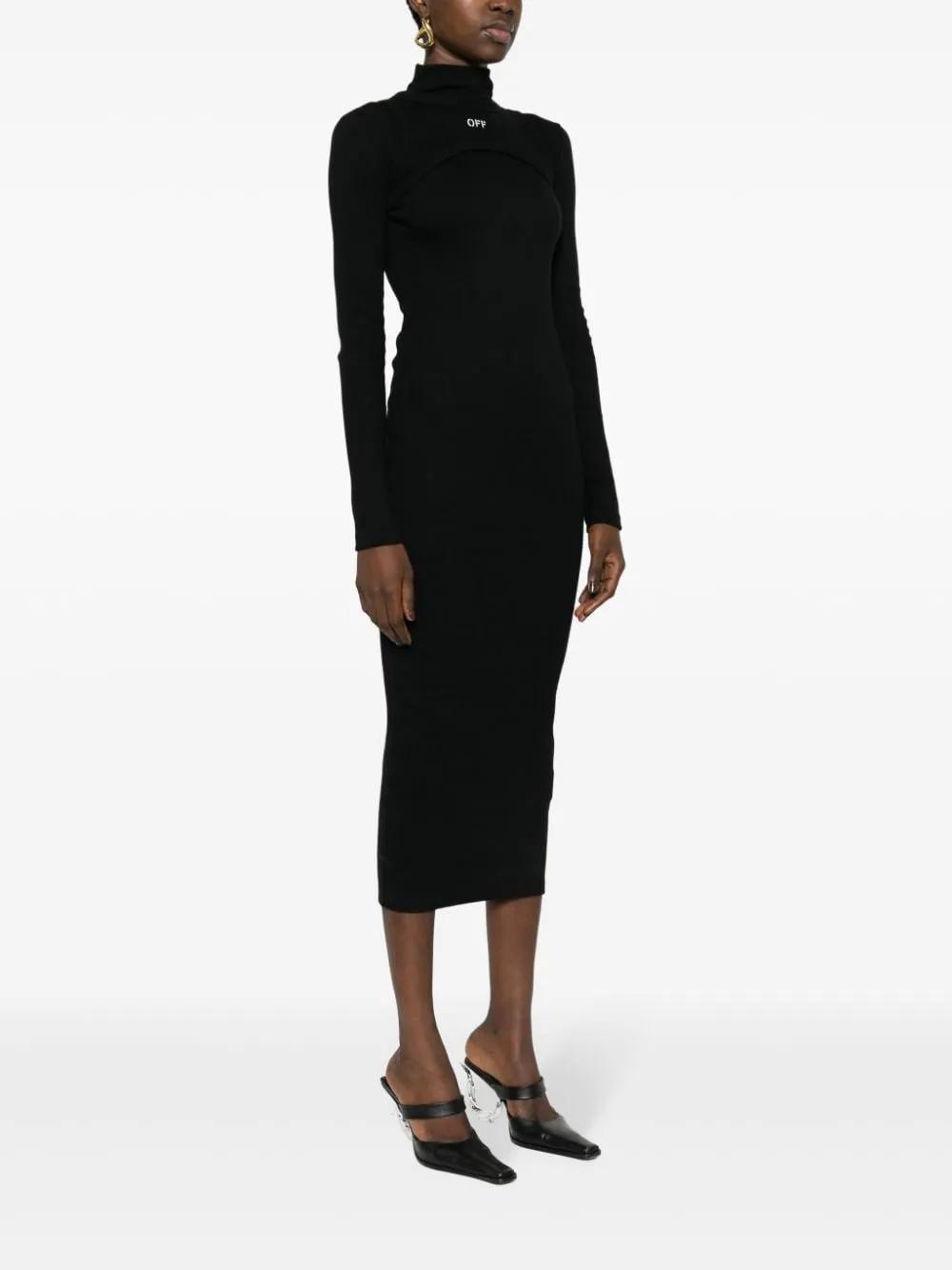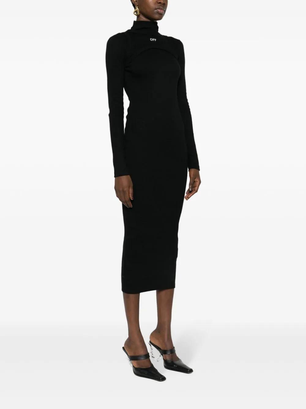Exuding a sleek and sporty quality, this black dress by Off-White is made from stretch-cotton ribbed knit to a mid-length silhouette with a harness-like layer along the neckline. It is finished with the brand's signature Off Stamp logo embroidered at the chest.