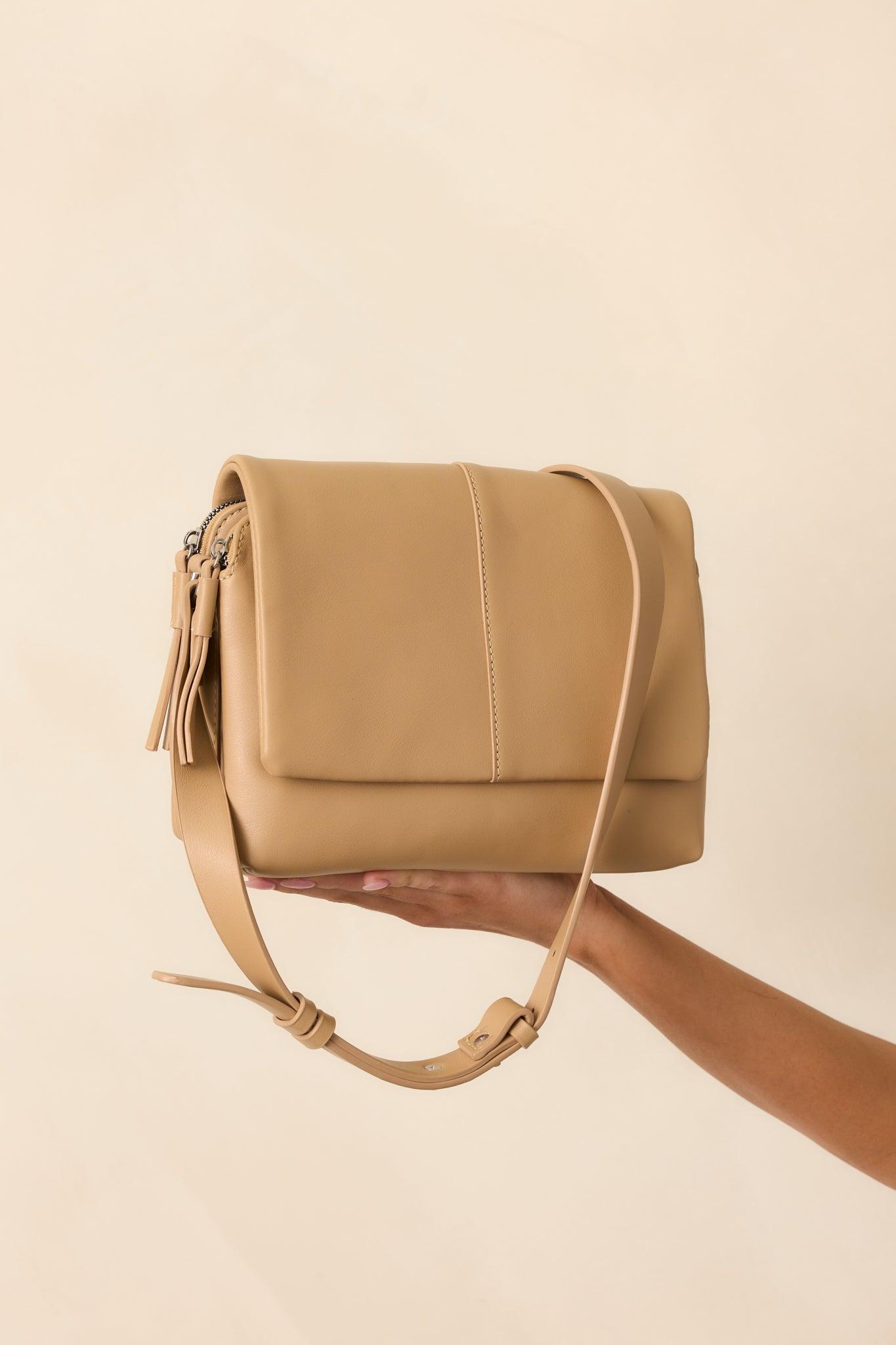 The Off The Record Tan Faux Leather Crossbody Handbag is for the days when you're keeping things effortlessly cool. Understated but never overlooked, it’s the kind of piece that speaks volumes—without saying a word. This tan handbag features a rectangular shape, faux leather material, magnetic flap closure, silver hardware, adjustable crossbody strap, magnetic center pocket, two zipper closure pocket, and faux leather tassel zippers. This Bag Measures: 9.75" in Length, 3.5" in Width & 7.5" in Height 100% Polyurethane Manufactured in China