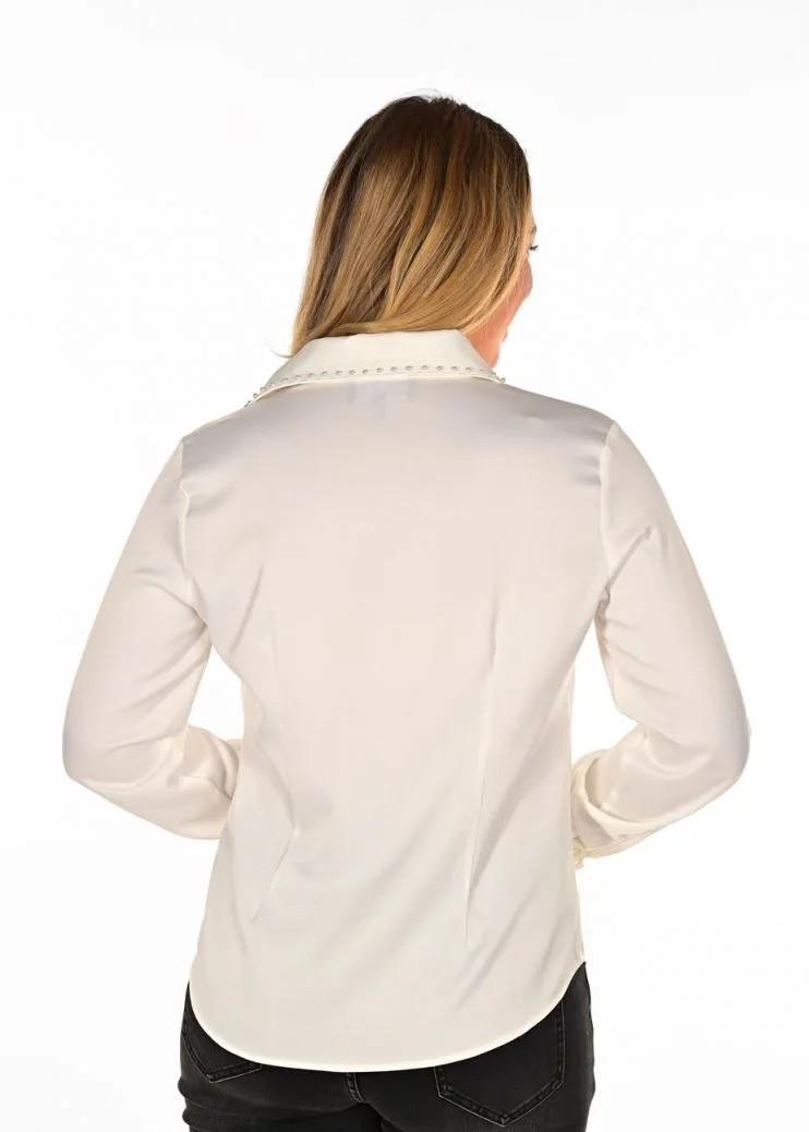 This off-white button-down blouse exudes elegance with its delicate pearl and rhinestone embellishments, adding a touch of sophistication to any ensemble. Its timeless design makes it a versatile and stylish addition to any wardrobe, perfect for both casual and formal occasions. 234119U