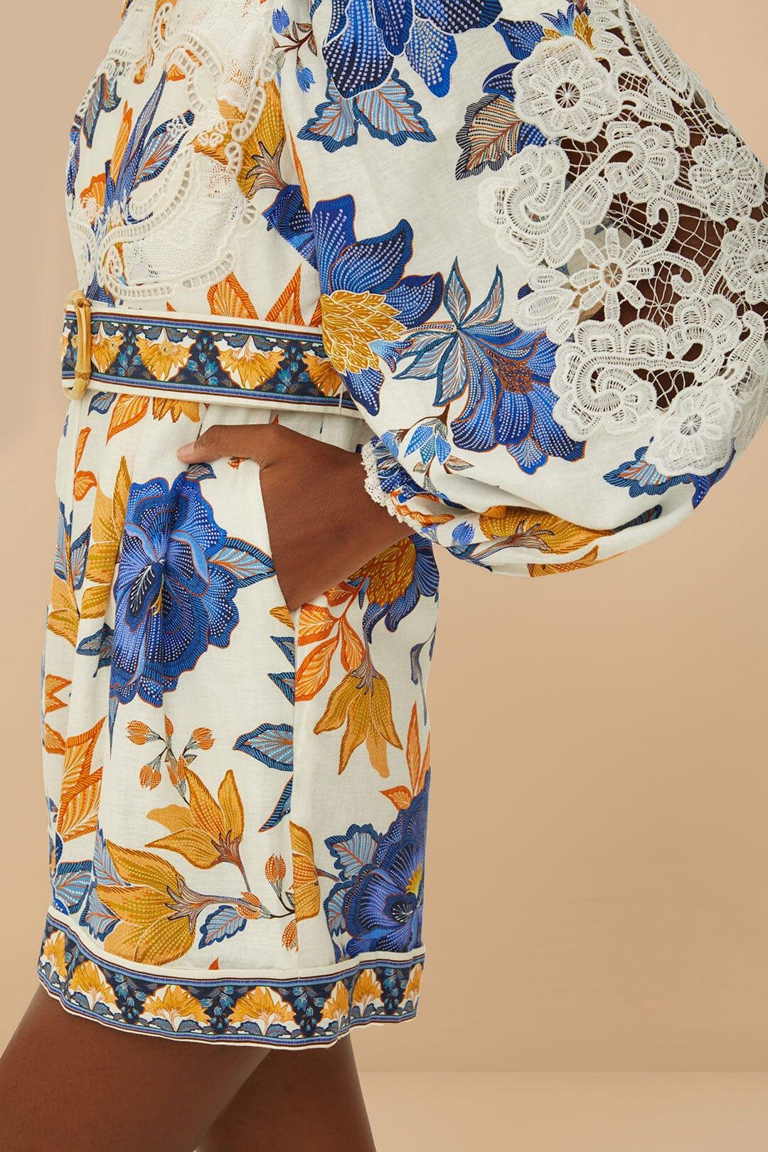 Embrace playful elegance with the Off-White Summer Flowers LENZING™ ECOVERO™ Euroflax™ Romper. This enchanting piece features a square neckline with voluminous sleeves adorned with intricate eyelet embroidery, enhancing its charm. The vibrant floral pattern in blue, orange, and yellow hues evokes a carefree summer vibe. Crafted from responsible materials, this romper effortlessly combines comfort and style, making it a delightful addition to your wardrobe. LENZING™ ECOVERO™: the eco-responsible fibers generate up to 50% lower emissions and water impact compared to generic viscose. Embrace sunshine with the off-white summer flowers LENZING™ ECOVERO™ Euroflax™ romper. This enchanting piece radiates charm through its playful floral patterns and comfortable silhouette. The square neckline beautifully frames the face, while the luxurious blend of LENZING™ ECOVERO™ and Euroflax™ ensure both comfort and sophistication. Crafted with responsible materials, this romper captures the essence of effortless elegance, perfect for sunlit escapades and warm gatherings alike.Composition 55% LINEN 45% VISCOSECare Instructions MACHINE WASH GENTLE CYCLE, DO NOT BLEACH, TUMBLE DRY LOW, IRON AT LOW HEAT, DRY CLEAN WITH ANY SOLVENT EXCEPT TRICHLOROETHYLENESize and Fit Inches XXS XS S M L XL Bust 29 1/4 31 33 35 38 1/4 41 1/4 Waist 25 1/4 27 1/4 29 1/4 31 34 1/4 37 2/4 Length 23 23 3/4 24 2/4 25 2/4 26 1/4 27 Hip N/A N/A N/A N/A N/A N/A