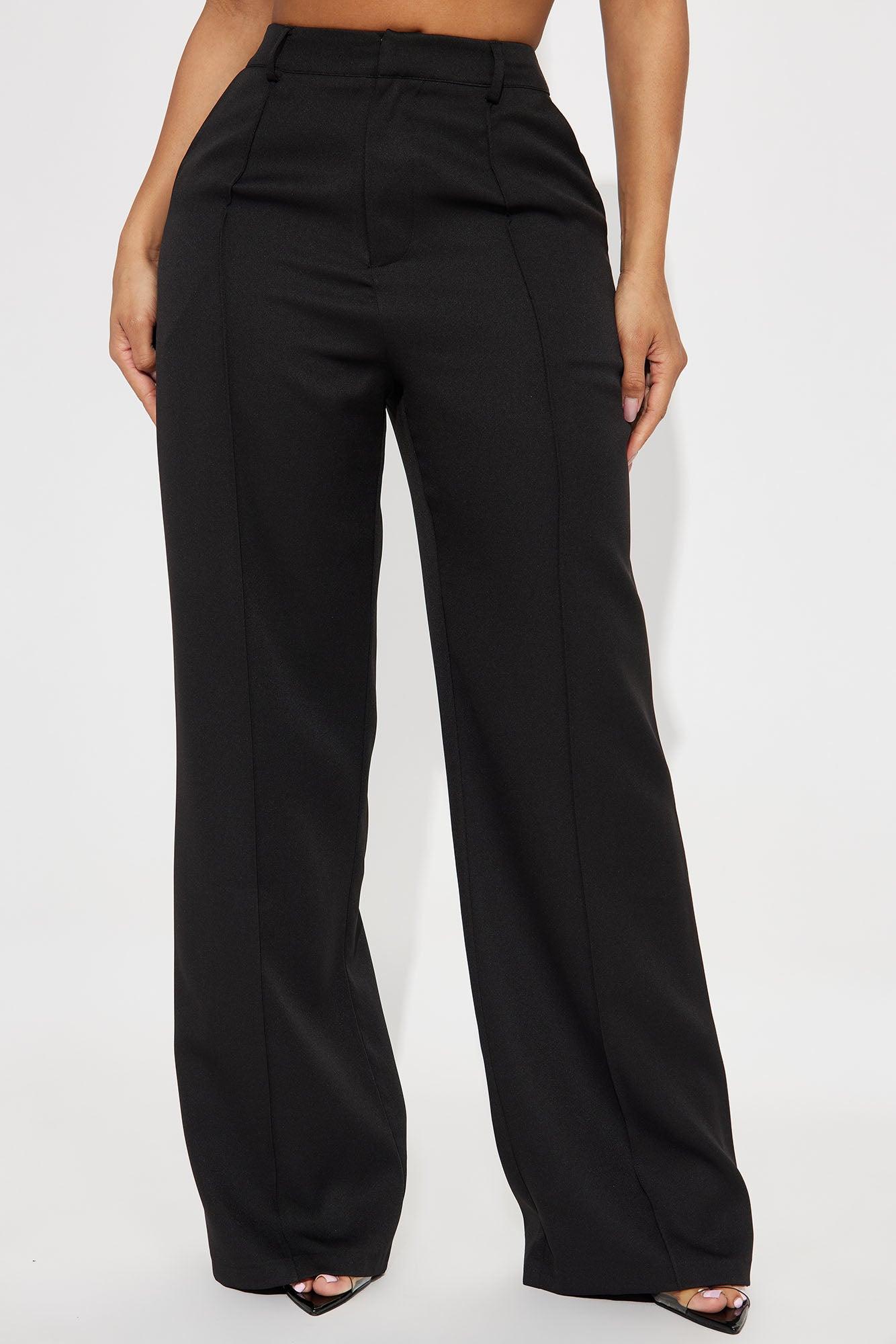 Available In Black And Chocolate. Trouser Pant High Rise Hook & Bar Closure With Zip Fly Hand Pockets Faux Back Welt Pockets Front Seaming Detail Wide Leg Non Stretch 32" Inseam Pair With "Office Behavior Oversized Blazer" Self: 92% Polyester 8% Spandex Imported California Proposition 65 WARNING: Cancer and Reproductive Harm - www.P65Warnings.ca.gov.
