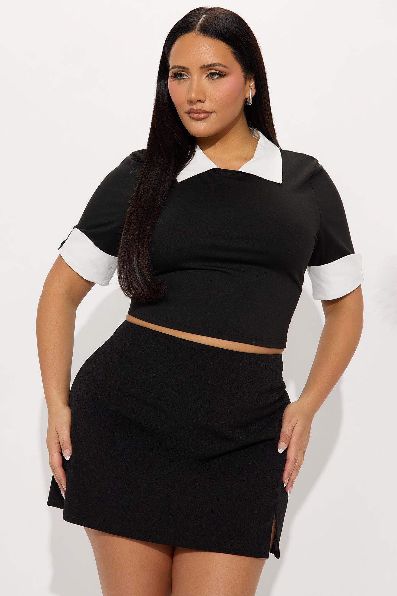 Available In Black. Top Collar Short Sleeve Cropped Stretch Self : 85% Polyester , 15% Spandex Contrast: 97% Cotton, 3% Spandex Imported