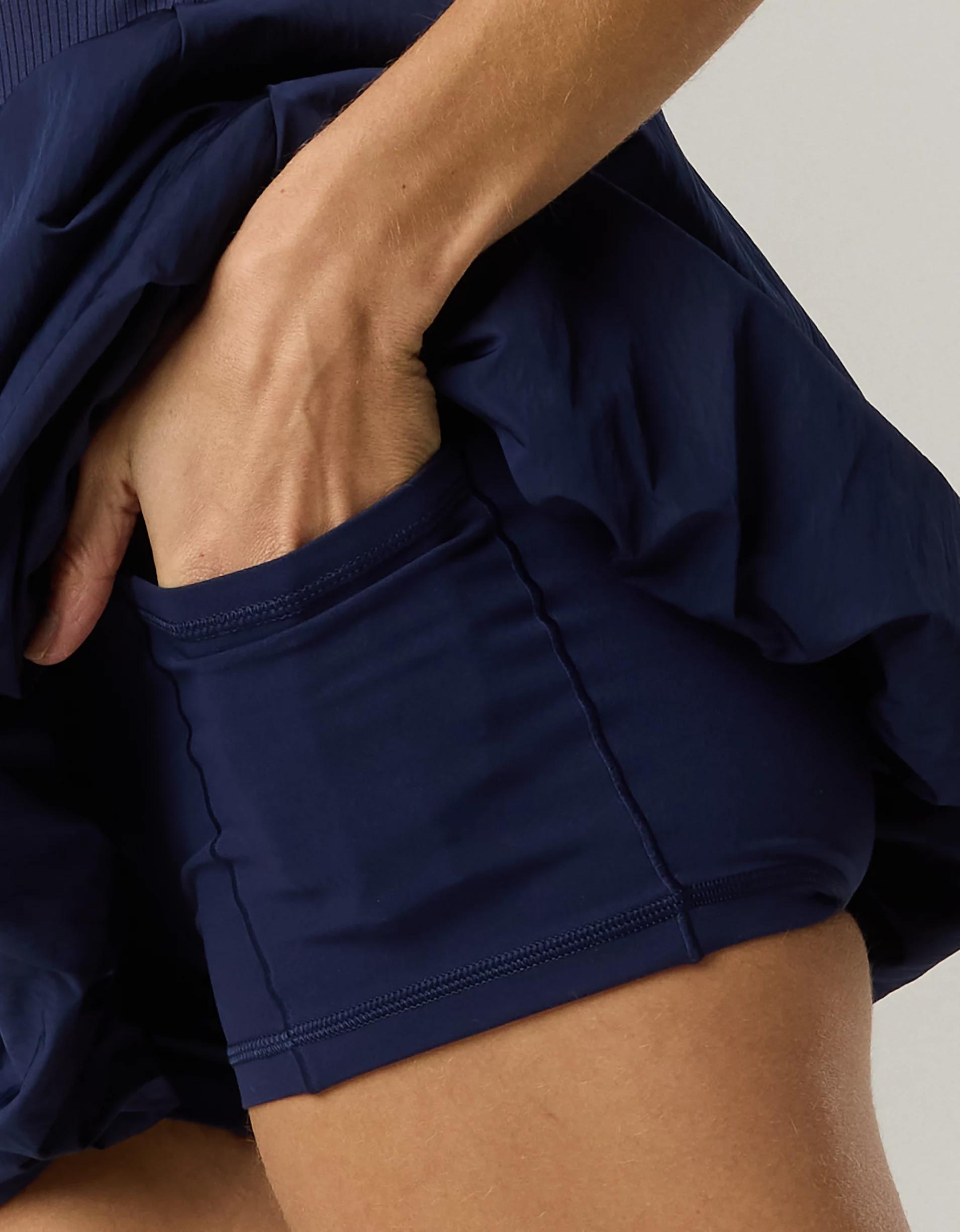 THE RUNDOWN: Smooth, sweat-wicking ribbed jersey on top, structured nylon bubble silhouette.