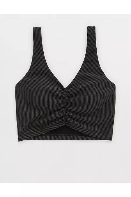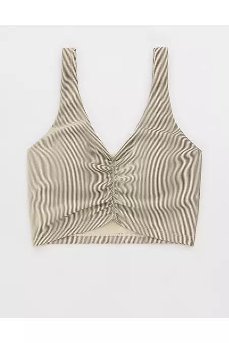 THE LOOK: Two-toned stripe ribbing. Gorgeous ruching./THE FEEL: Light support for all cup sizes. Built-in shelf with removable pads./THE MOVES: Made for low-impact days (but can handle a little sweat)./Accessibility deets: tagless label to minimize i