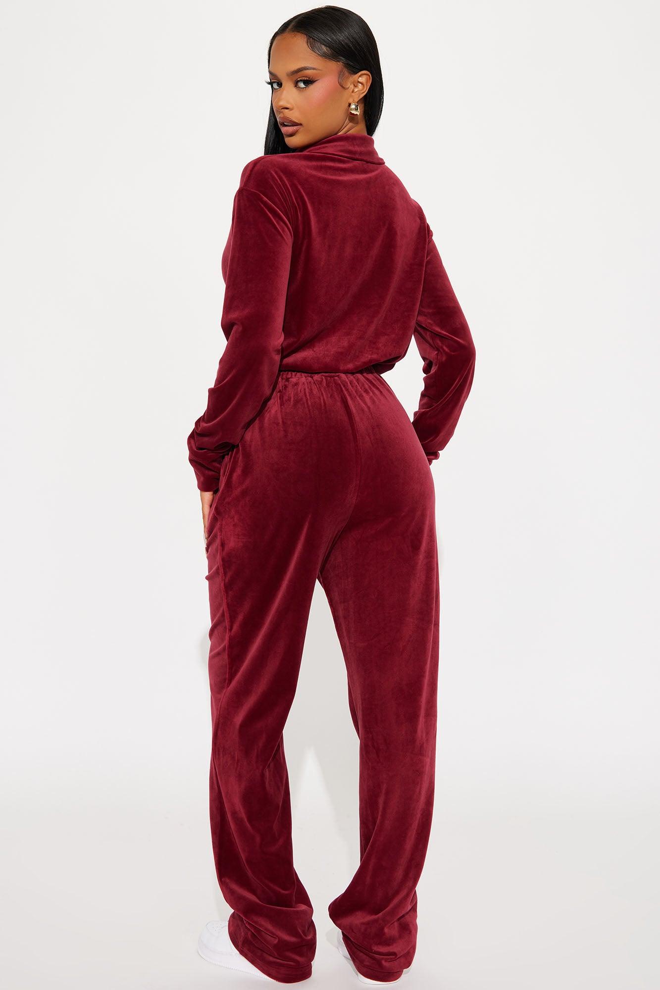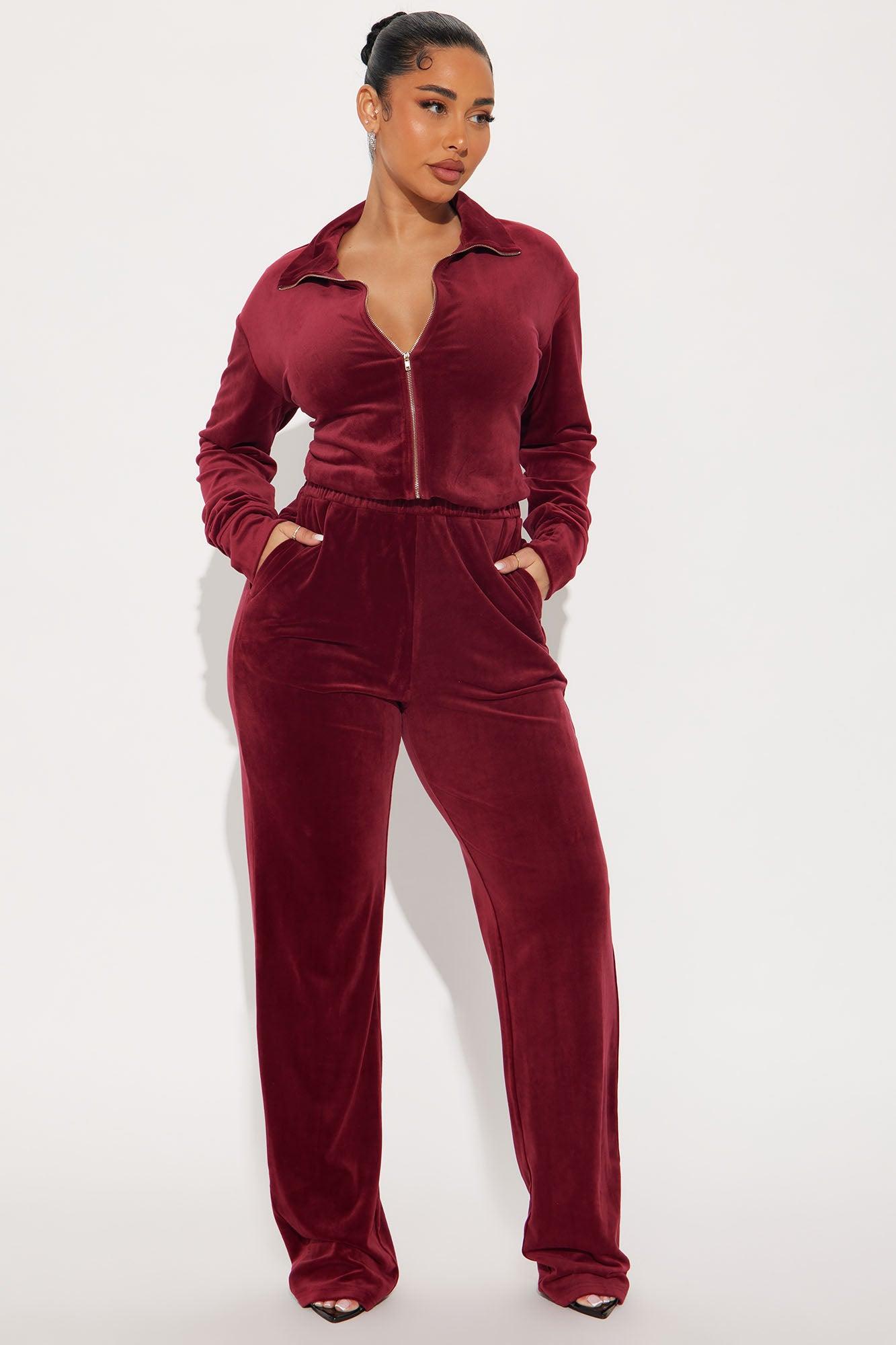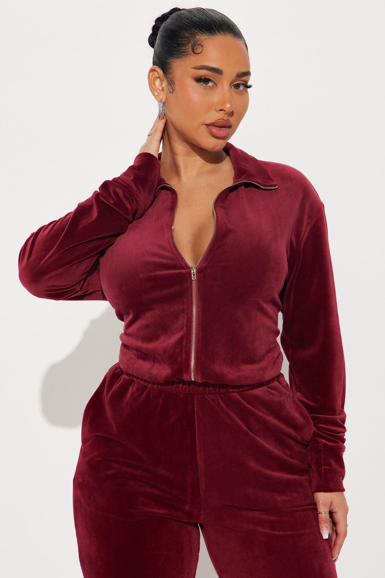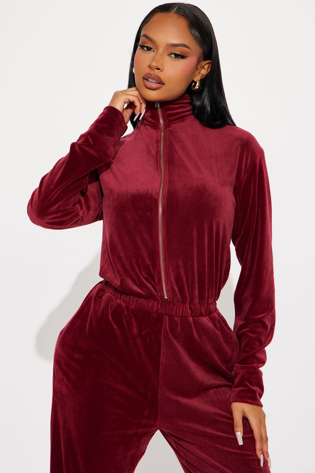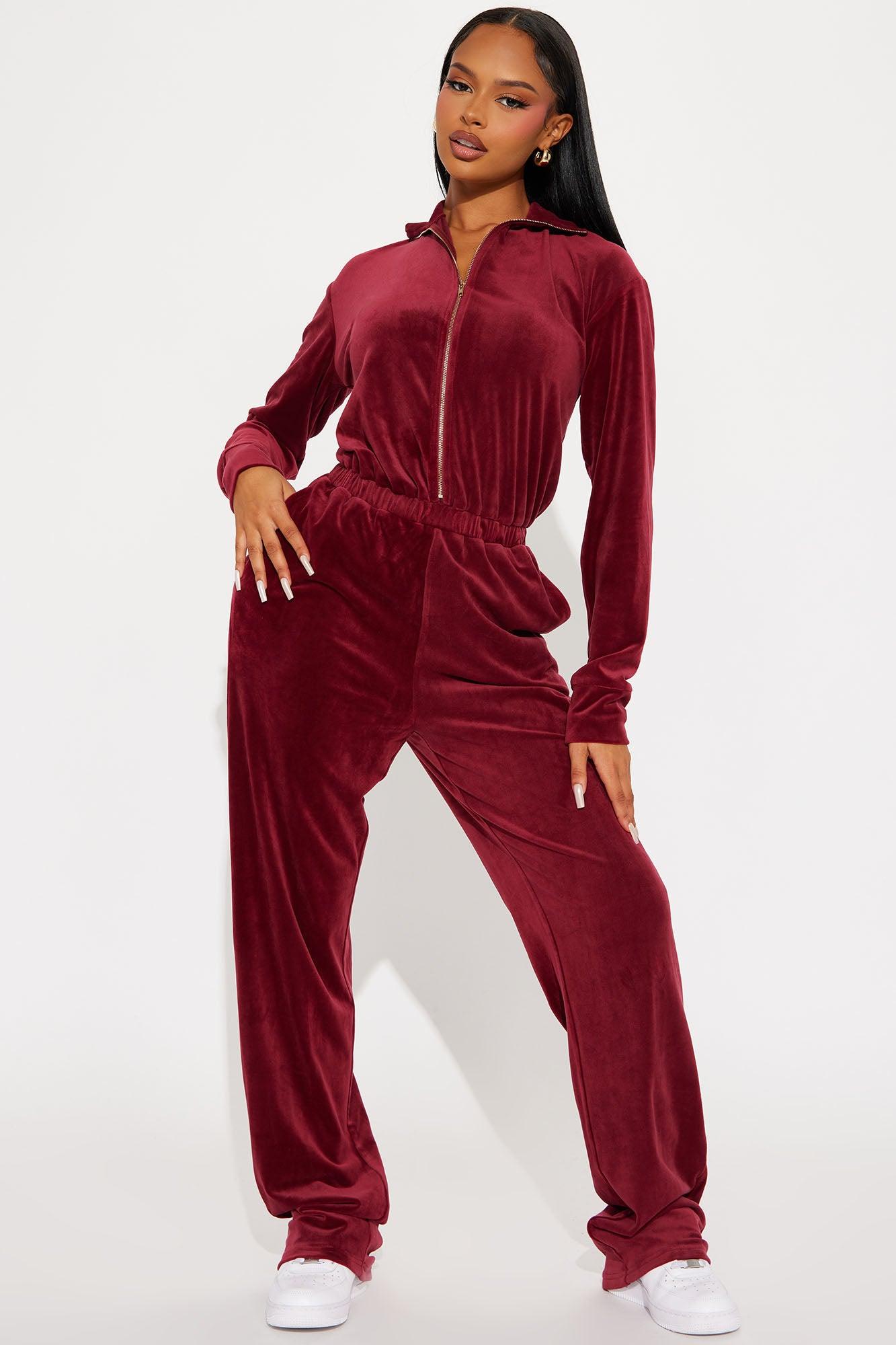 Available In Charcoal And Burgundy. Velour Jumpsuit Collar Long Sleeve Front Zipper Elastic Waistband Pockets Straight Leg Stretch Inseam= 33" Self: 94% Polyester 6% Spandex Imported California Proposition 65 WARNING: Cancer and Reproductive Harm - www.P65Warnings.ca.gov.