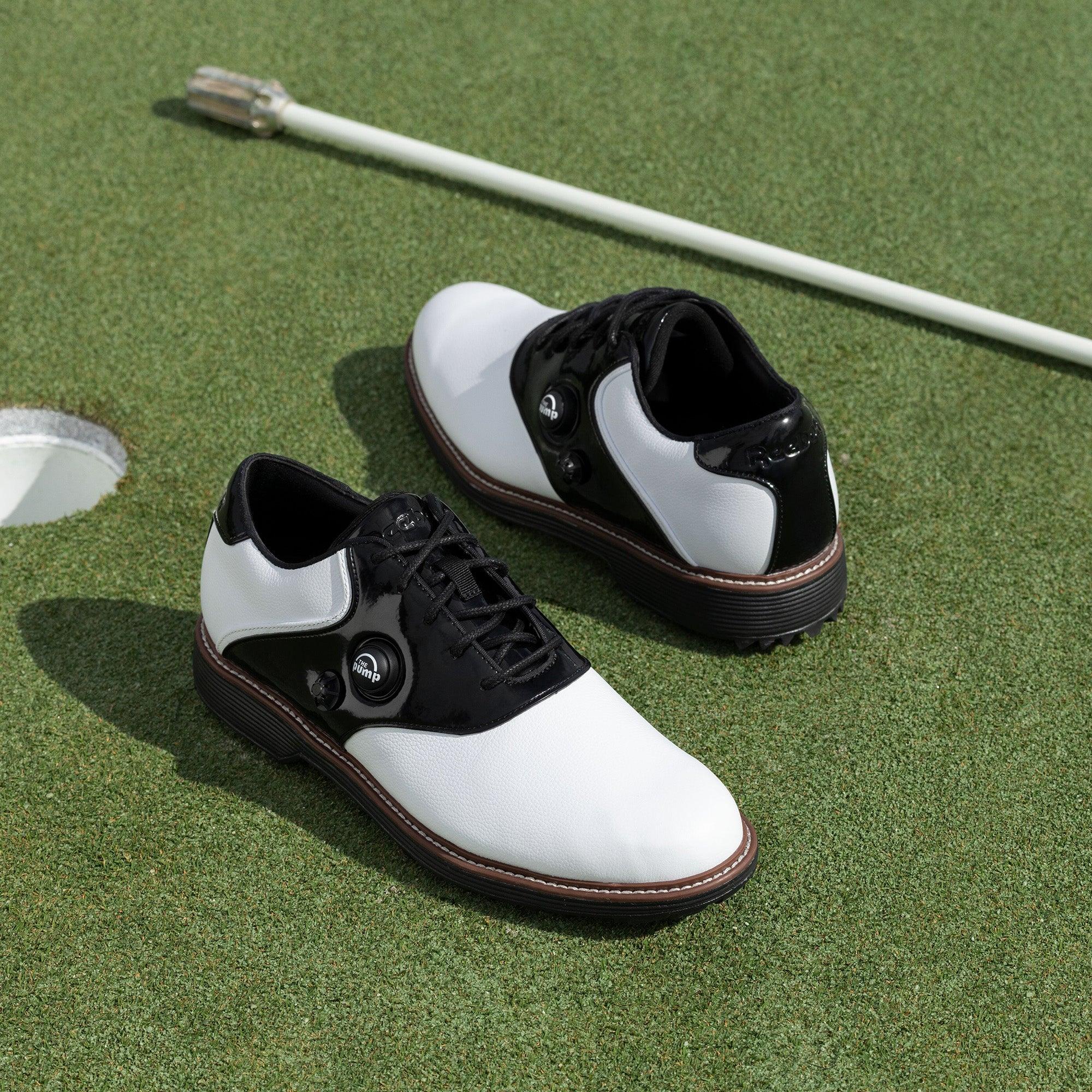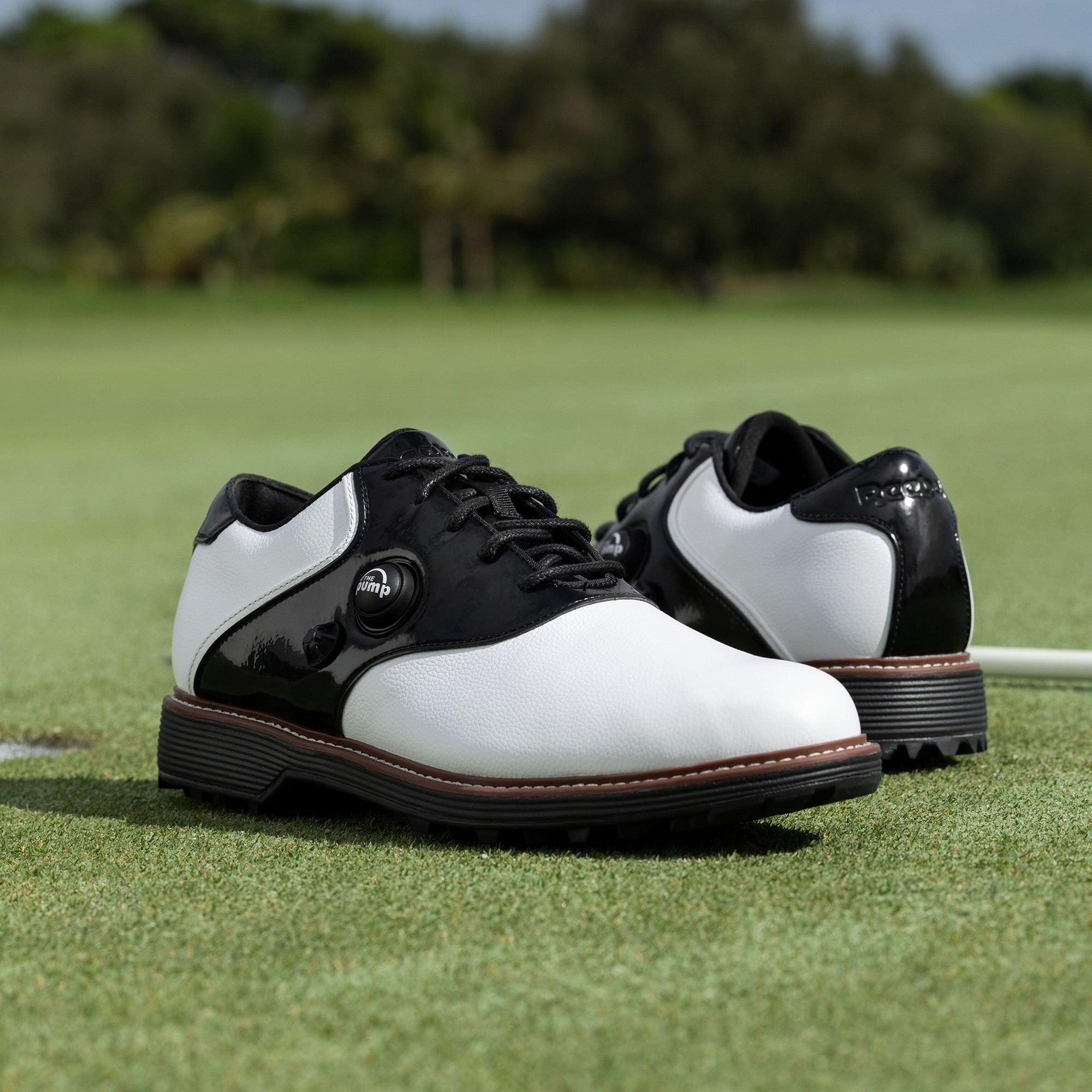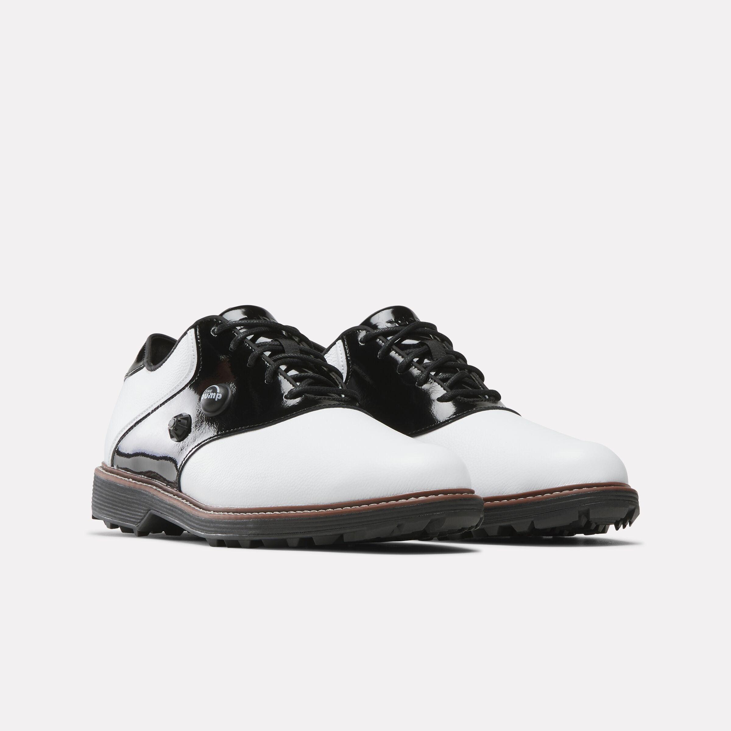 Spikeless golf shoes with a pebbled leather upper Raise your game in these Reebok golf shoes. They're designed with The Pump technology for a locked-down fit. A pebbled leather upper stands up to drizzly days and wet courses. The spikeless outsole keeps you grounded from the first hole to the last.