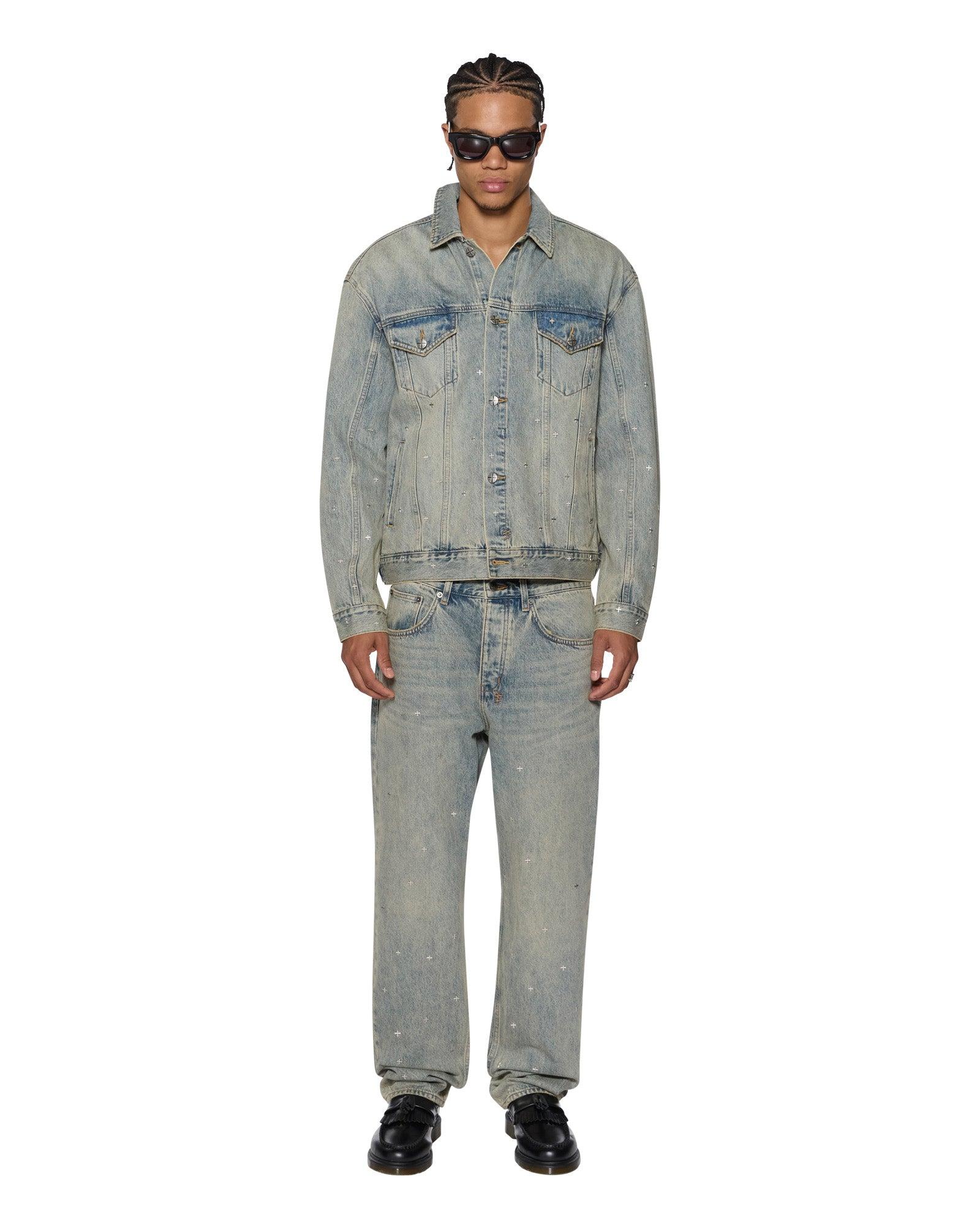 The OH G Jacket Stagelight Metalik is an oversized fit trucker jacket made from premium rigid indigo denim with a vintage tinted stone wash. The jacket features a traditional denim trucker construction and panelling, with metal plus hotfixes applied on the front and back of the garment, heavier towards the hem, grading away towards the waist. Finished with T-box and 4x4 embroidery branding and Ksubi branded hardware.