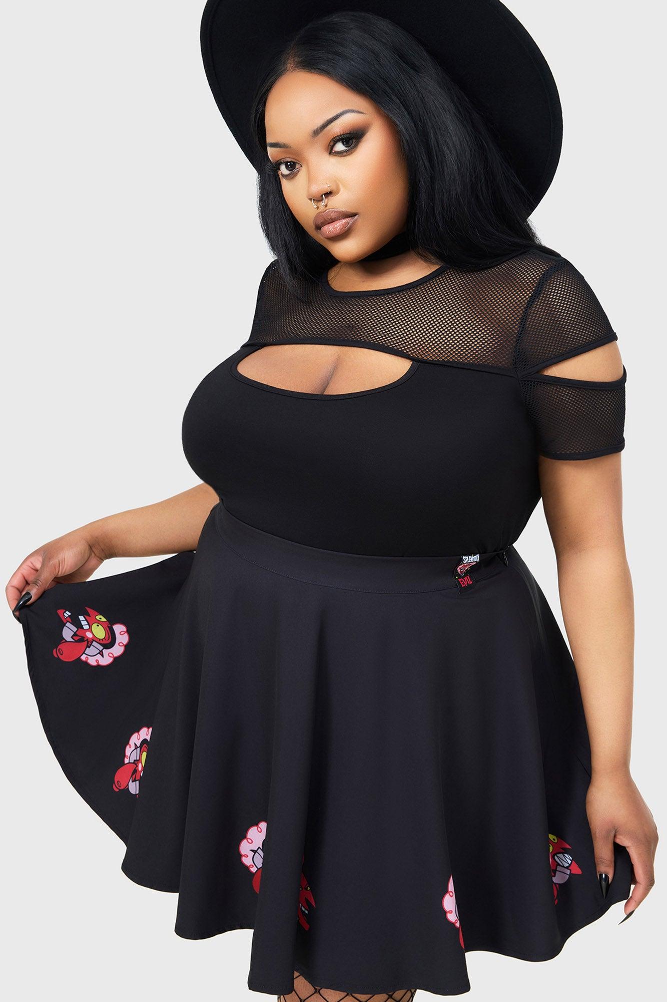 OH SO EVIL.- Official Licensed Product. - Soft-touch, jersey.- Statement HIM print.- Thick waistband.- Flared.With KILLSTAR branding, 95% Polyester 5% Elastane.Machine wash cold (30°c) / Do not bleach / Do not tumble dry / Iron at low temperature / Do not dry clean / Wash and iron inside out. Imported.