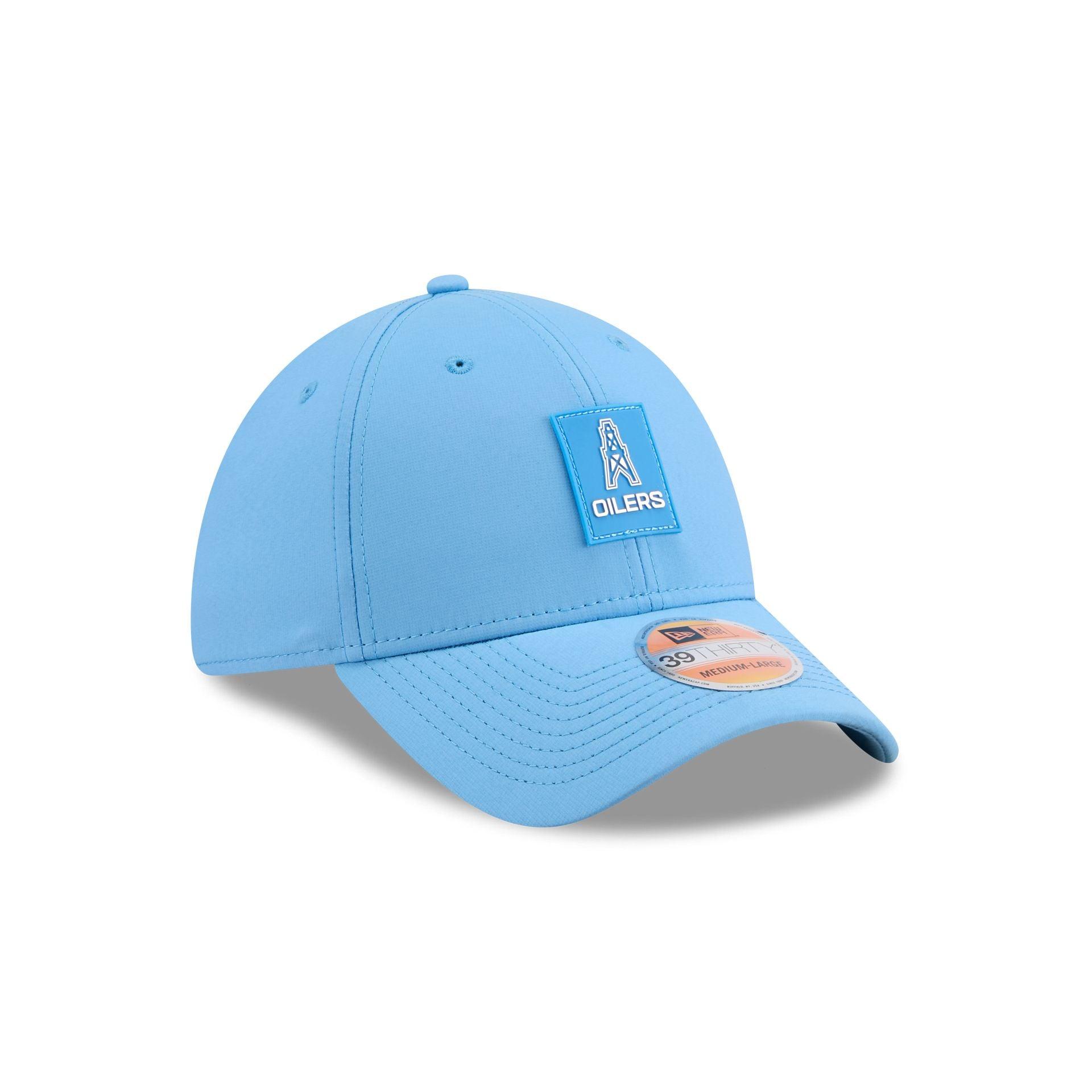 The Oilers 2025 Sideline Hot Weather Historic 39THIRTY Stretch Fit features a sewn-down silicone Oilers historic logo patch at the front panels with the Official NFL Shield logo at the rear. The cap has a water-repellent quill tech fabrication throughout, with an insulated crown and quick-dry cushioned sweatband. The undervisor is accented with a silicone transfer in the team’s colors.