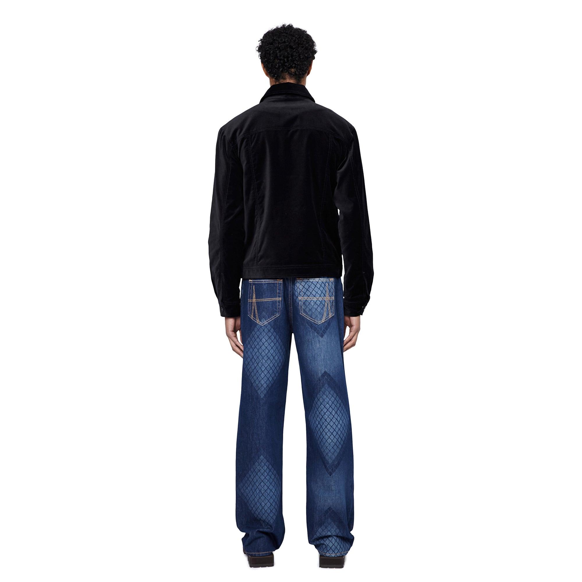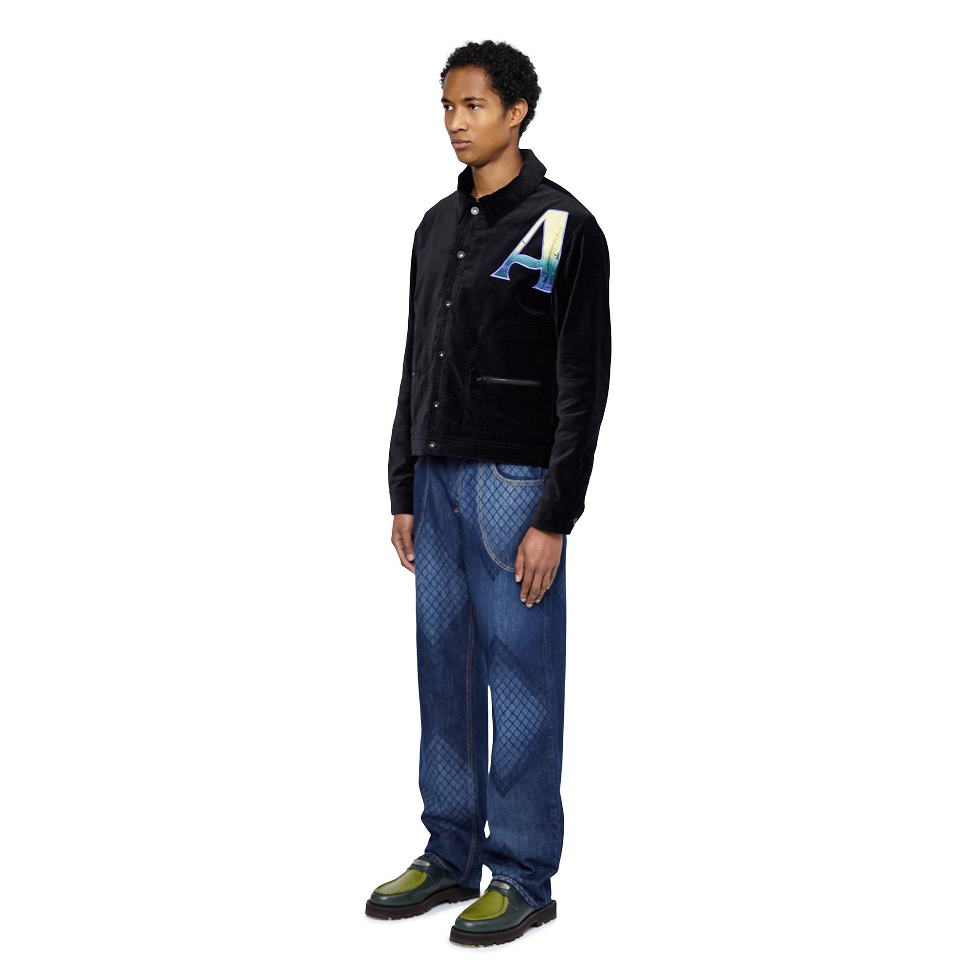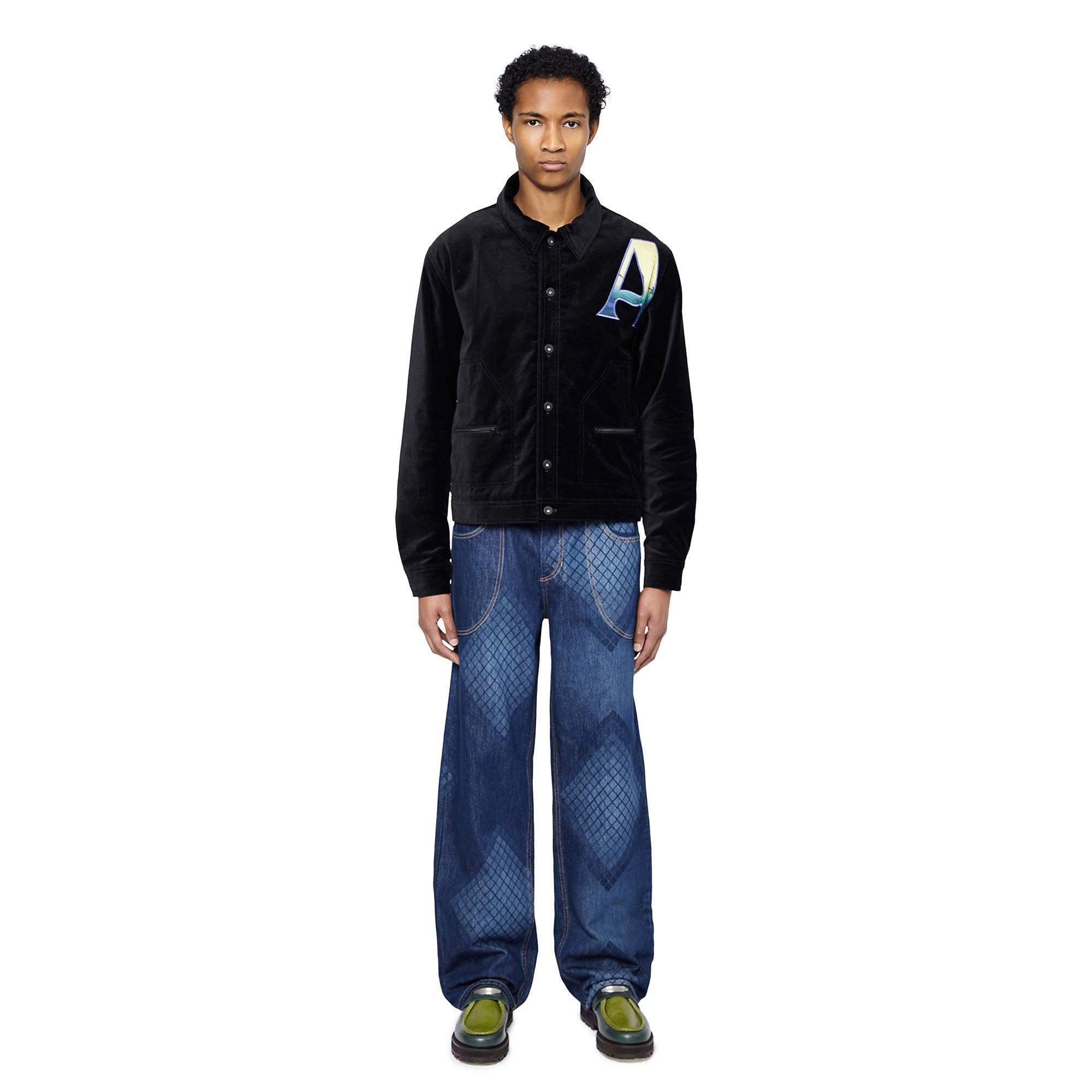 Description: The Okigbo jacket is designed with a boxy silhouette featuring a button-up closure, along with exposed side front zip pockets and inseam side pockets. The jacket features all-black tonal hardware and topstitching for an elevated and sleek finish. Made from a luxurious velvet fabric and is fully lined in our Ahluwalia branded cupro lining. It also has a satin applique 'A' embroidered on the chest that is printed in this season's graphic. Sizing: Click here for size guide. For further sizing assistance please contact us on