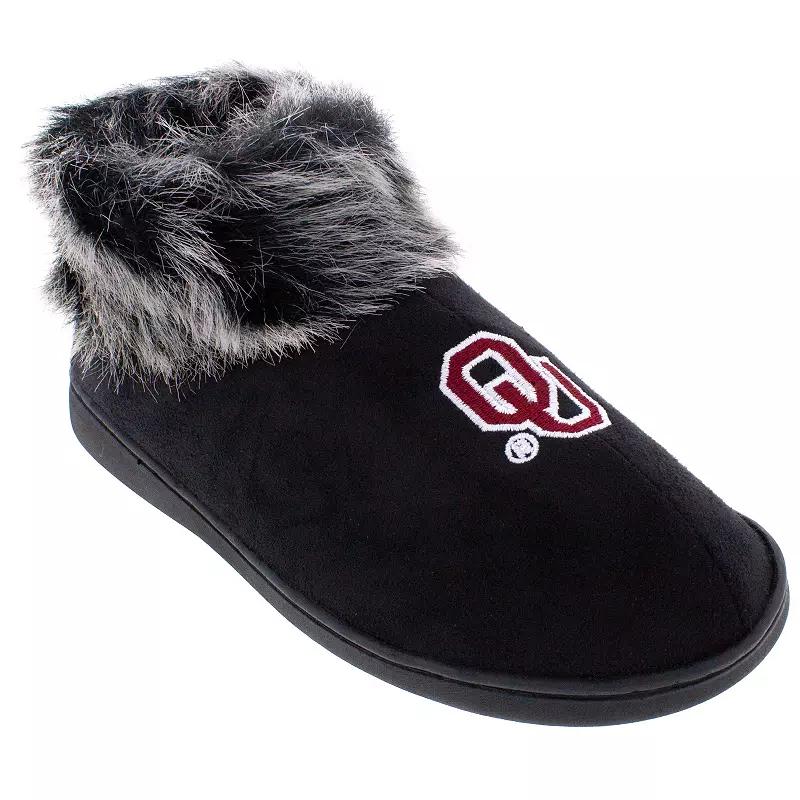 Get cozy with these Oklahoma Sooners womens faux-fur slippers. Get cozy with these Oklahoma Sooners womens faux-fur slippers. Pull-on Logo embroidery and team colors Oficially licensed Cozy faux-fur trimFABRIC & CARE Polyester Rubber outsole Spot clean Imported Color: Black. Gender: female. Age Group: adult. Material: Faux Fur.