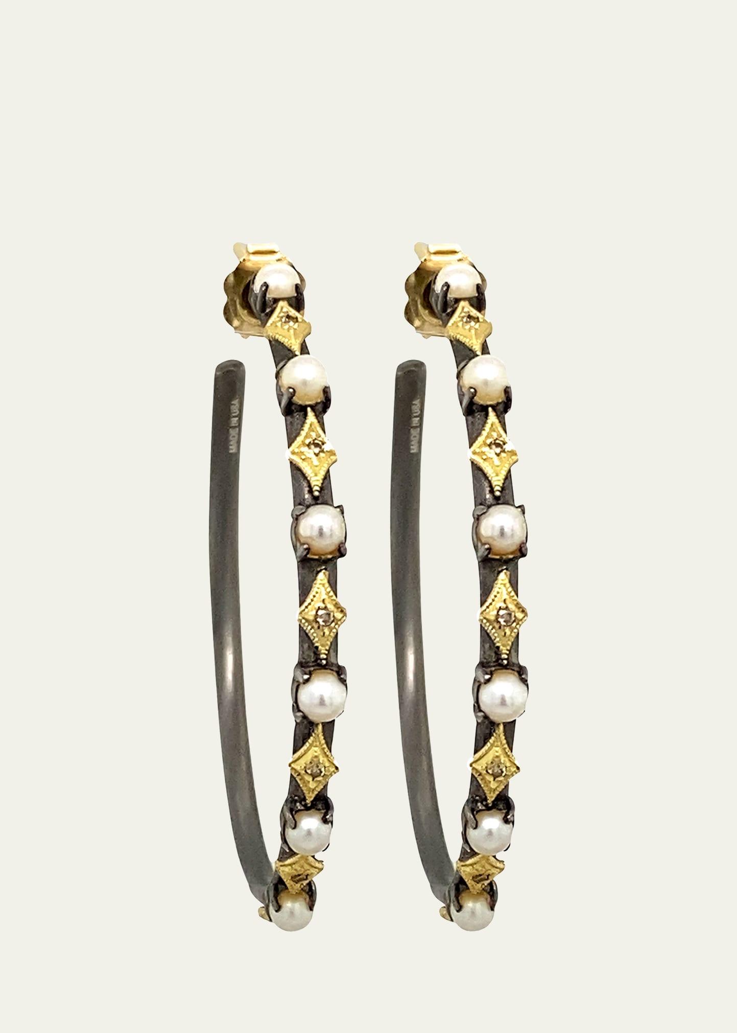 From the Old World Collection. Made of blackened sterling silver, these hoop earrings are adorned with alternating white seed pearls and champagne diamonds that rest in 18K-yellow-gold stations. Round white seed pearls, 35mm Champagne diamonds, 0.07 tcw Diamond color: C1-C6 Diamond clarity: I1 Blackened sterling silver/18K yellow gold Post back Made in USA. Lsd Jewelry - Jewelry Lsd Mp > Armenta > Saks Fifth Avenue > Barneys. Armenta. Color: White.