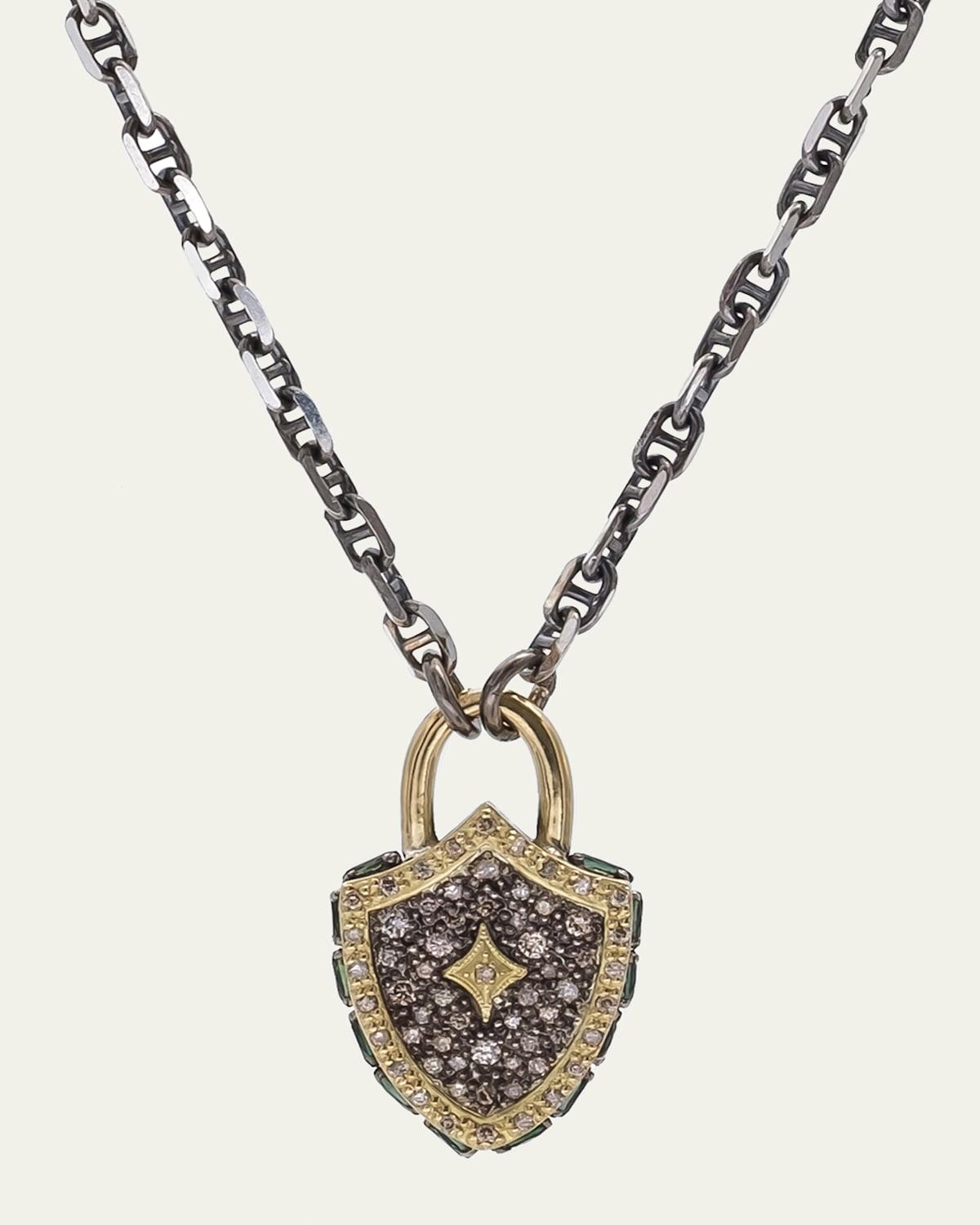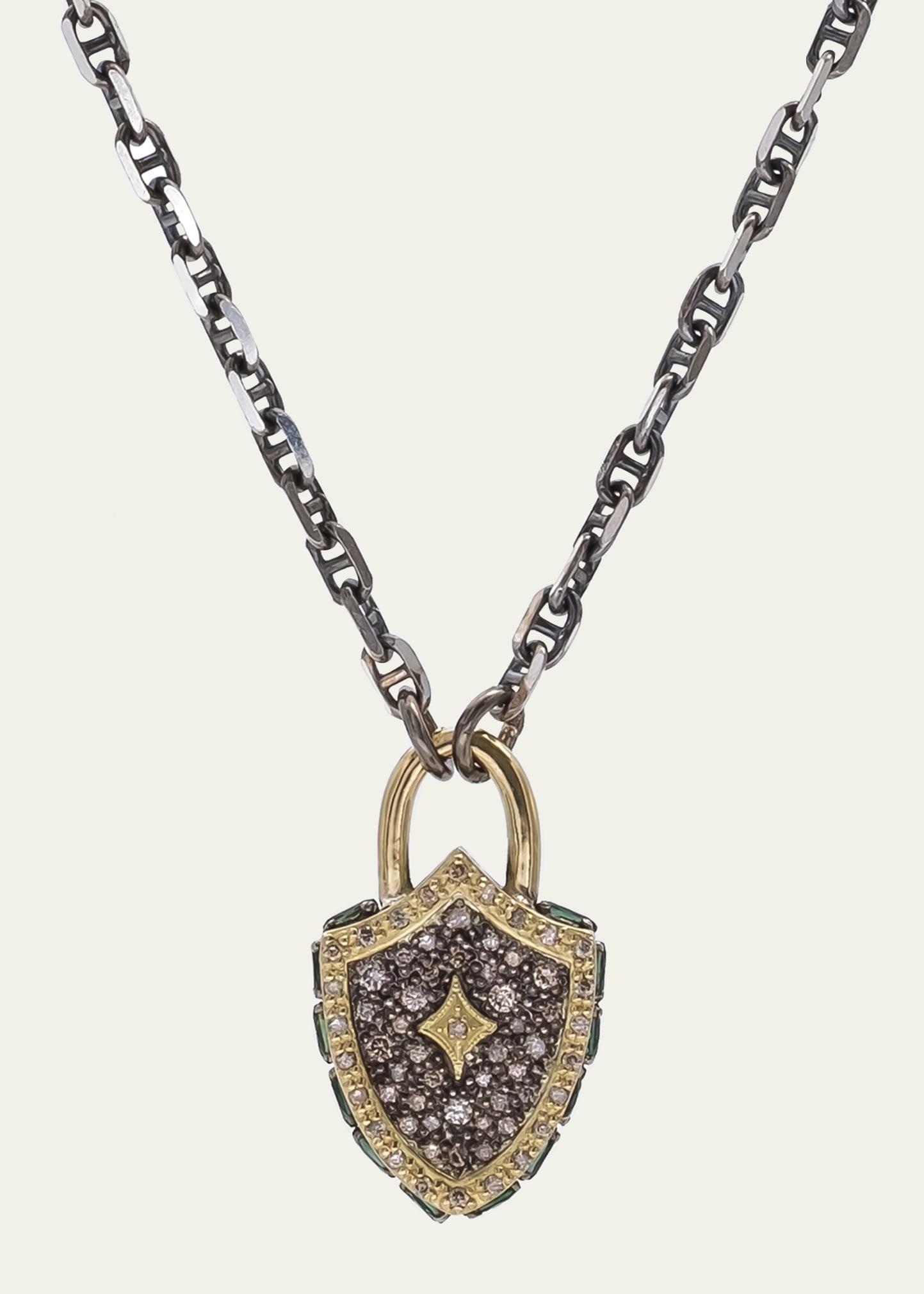 From the Old World Collection. Handmade of blackened sterling silver and 18K yellow gold, this necklace features an exquisite shield pendant that sparkles with blue-green tourmalines and champagne diamonds. Champagne diamonds, 0.45 tcw Blue-green tourmalines Sterling silver/18K yellow gold Toggle clasp Made in USA SIZE Adjustable 16-18 length. Lsd Jewelry - Jewelry Lsd Mp > Armenta > Saks Fifth Avenue > Barneys. Armenta. Color: Yellow Gold.