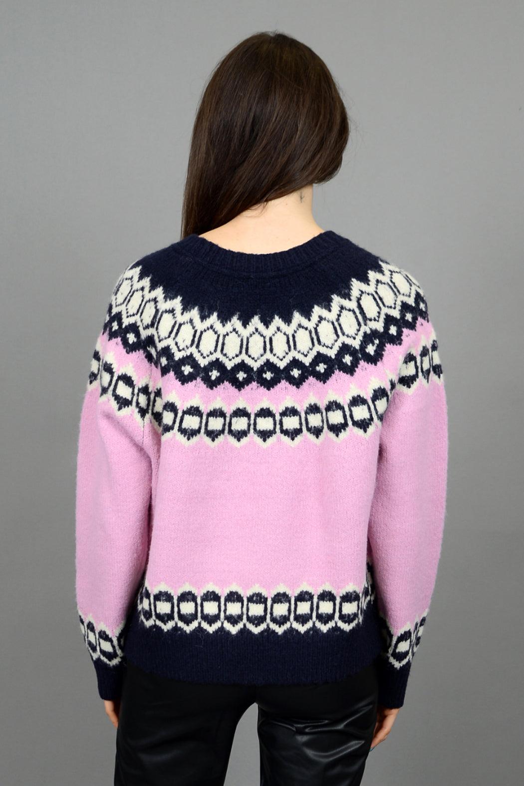 A fun twist on a classic fair isle sweater, this crewneck raglan sleeve sweater in baby pink, navy, and white, features a fair isle design across the chest and hems. Pair with jeans for a laidback festive look or dress it up with leather pants and heels for a holiday party.
