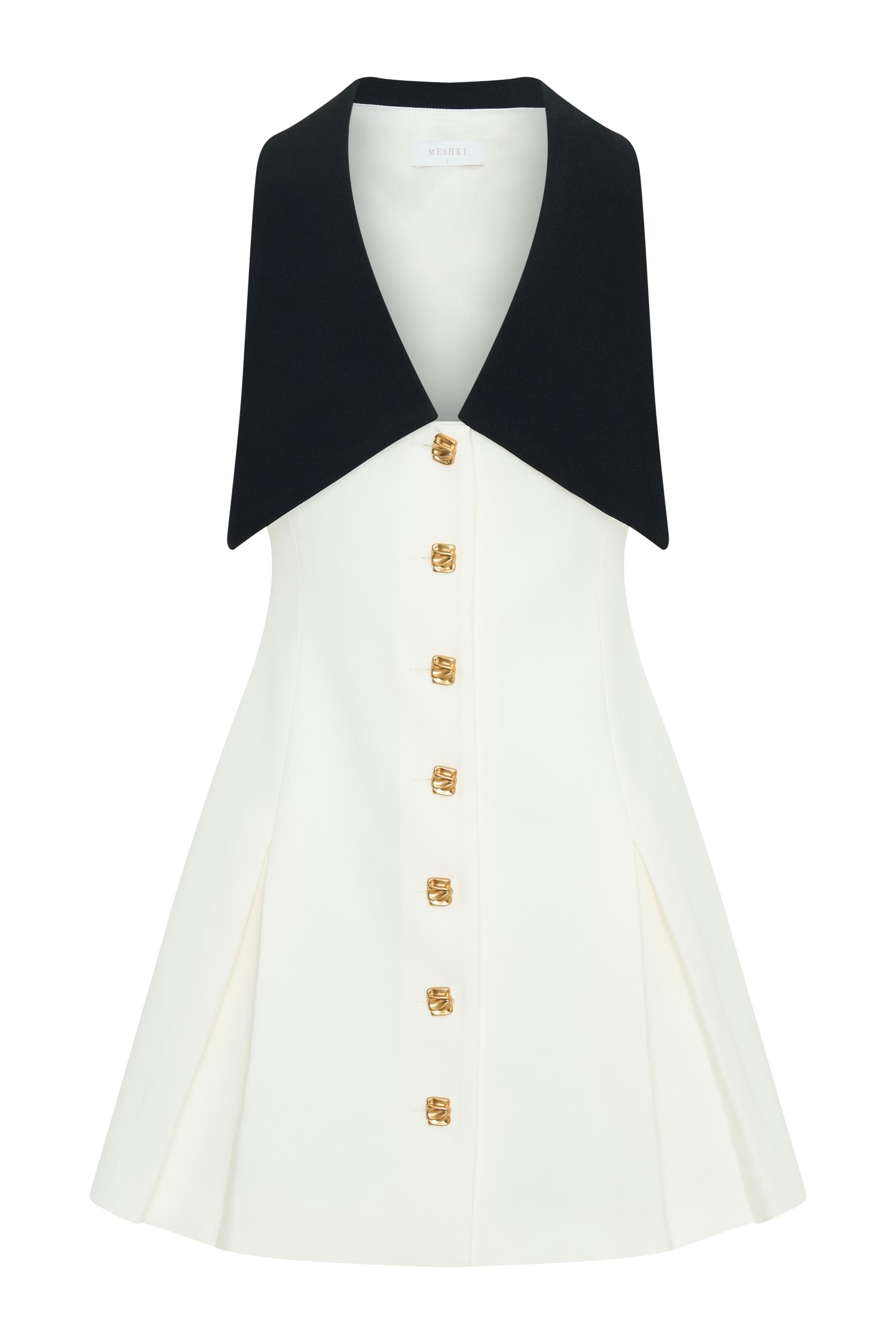Sharp and stylish. Step out in style with the OLI Sleeveless Contrast Mini Dress, a chic blend of timeless elegance and modern flair. Featuring a sharp collared neckline and button-front detail, this dress exudes polished charm. The flared pleated skirt adds movement and a playful touch, while the mini length keeps the look youthful and fresh. Decorative buttons and a striking black-and-white colorway with a contrasting collar elevate the design, making it perfect for any occasion. Whether for a daytime event or an evening out, this dress ensures you’ll always stand out in style.