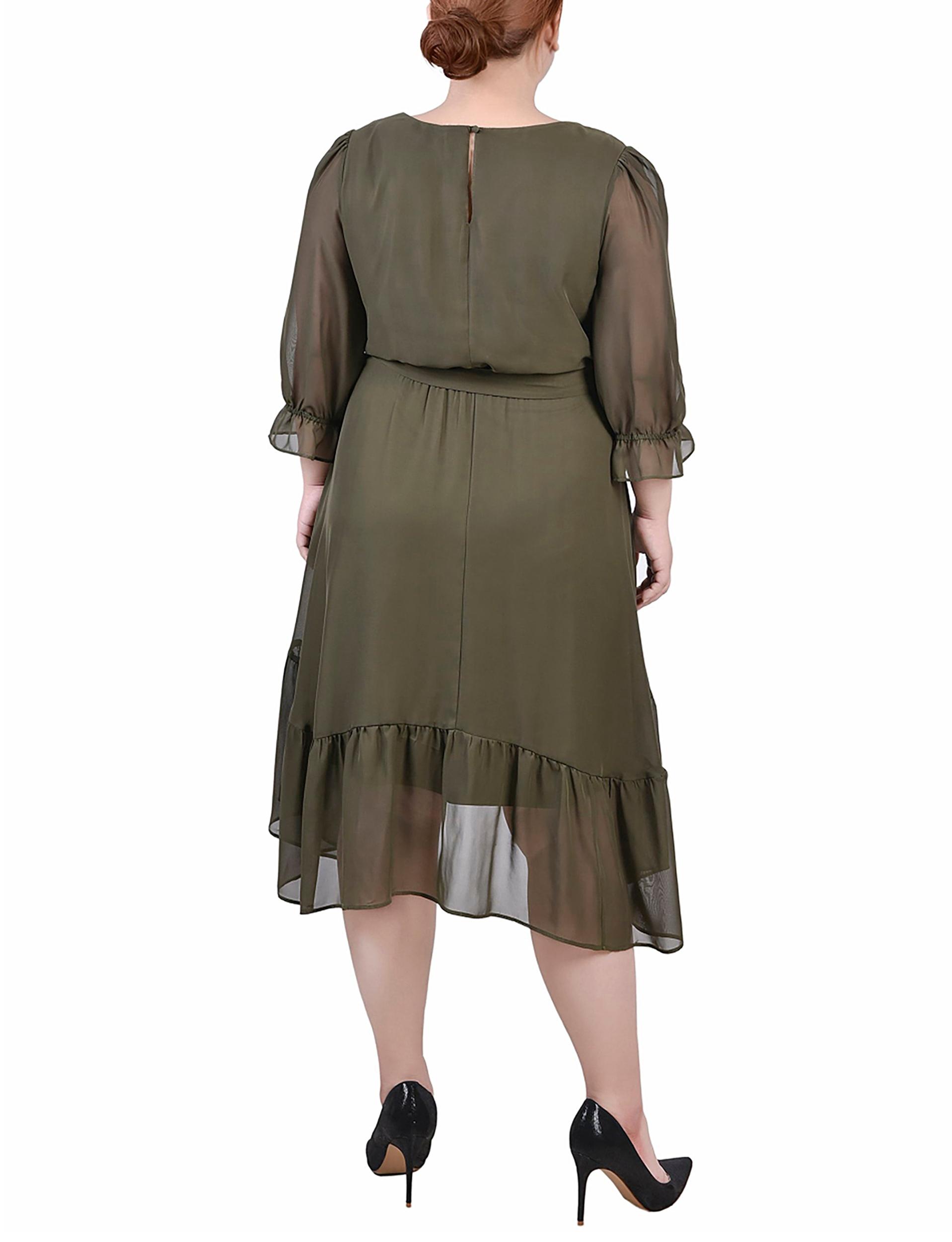 Olive 3/4 Sleeve V-Neck Flounced Dress - Plus