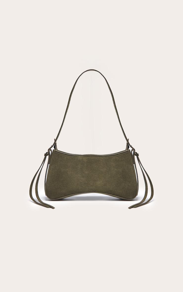 Anchor your evening aesthetic with an artful accessory. The olive faux suede curved beaded shoulder bag delivers a distinctive shape, defined by its elegant curved base and a sleek, structured upper line. A subtle beaded embellishment and a singular gold-tone sphere accent the slender shoulder strap, completing its refined design. Pair this sophisticated piece with a streamlined midi dress or impeccably tailored pants for an elevated occasion. Ground your look with classic black heels and complement the bag's hardware with delicate gold earrings, ensuring a confidently cohesive ensemble, articulating your elevated aesthetic. Approx Height: 12.5cm/5inch Approx Width: 23cm/9inch Approx Depth: 2.5cm/1inchp]:!mb-4inch>Brand: PrettyLittleThingCategory: AccessoriesProduct type: Shoulder BagColor: OliveMaterial: Faux SuedeOccasion: Evening